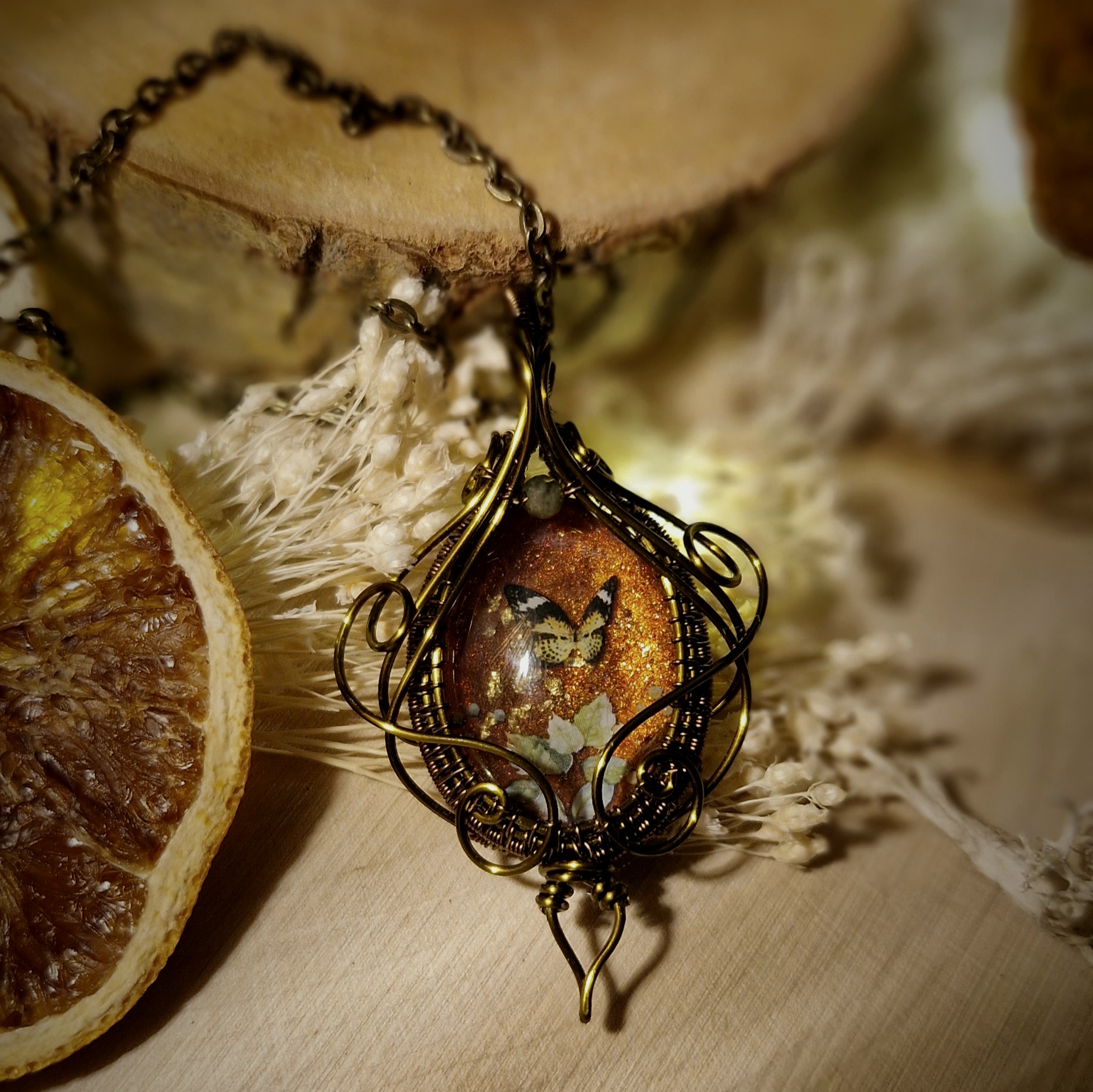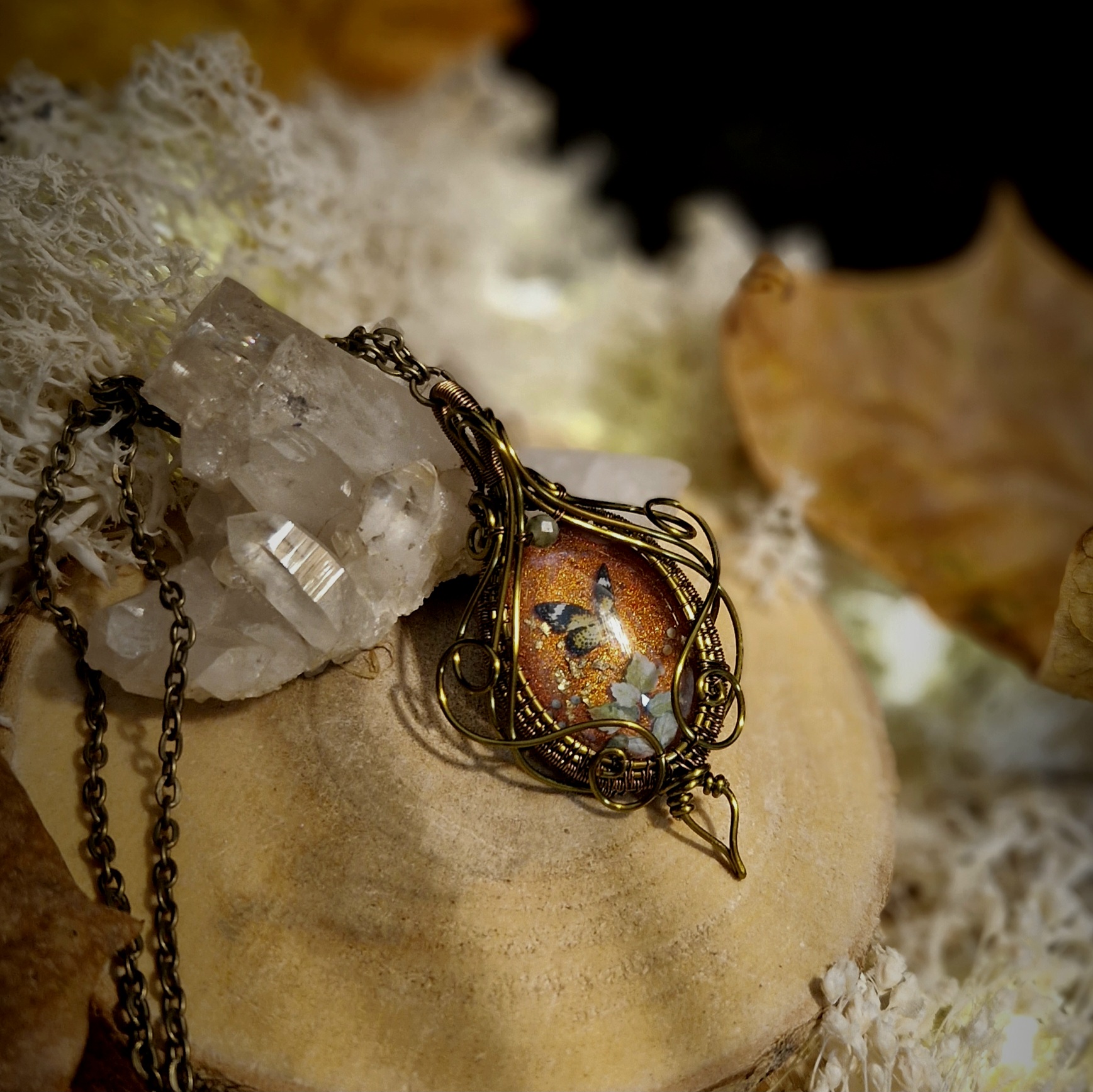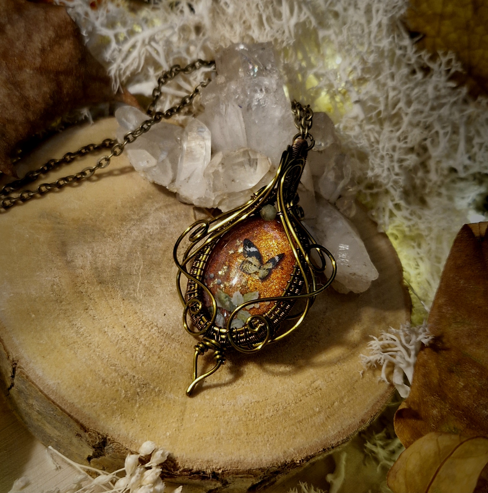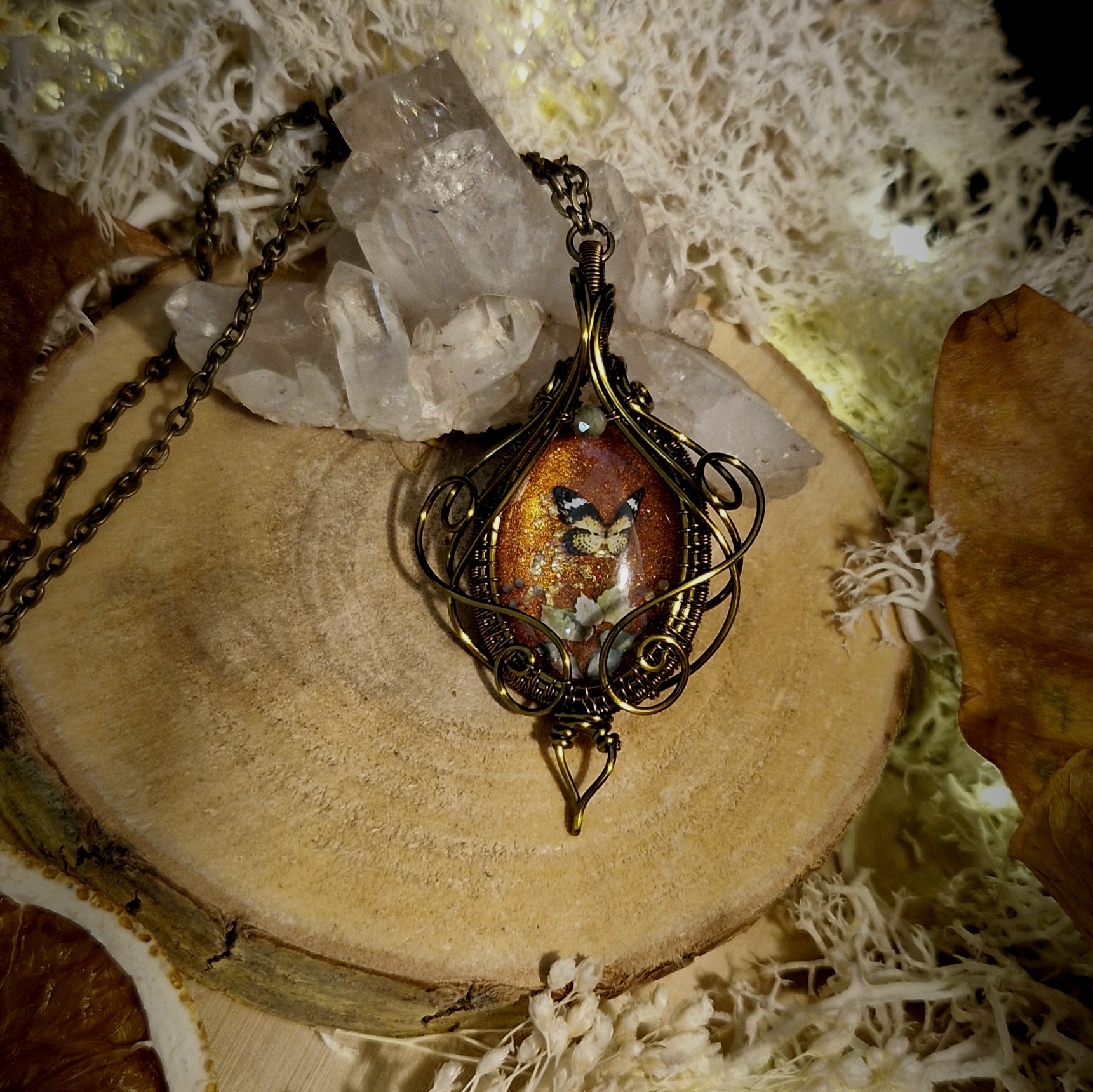 Parez-vous de magie avec ce pendentif fantaisie de haute qualité aux décors oniriques. Il vous dévoile un monde secret où papillons et fleurs dansent ensemble sous les derniers rayons dorés de la saison. Cette amulette vous ouvre les portes d’un automne enchanteur, où chaque instant sera une nouvelle occasion de rêver…