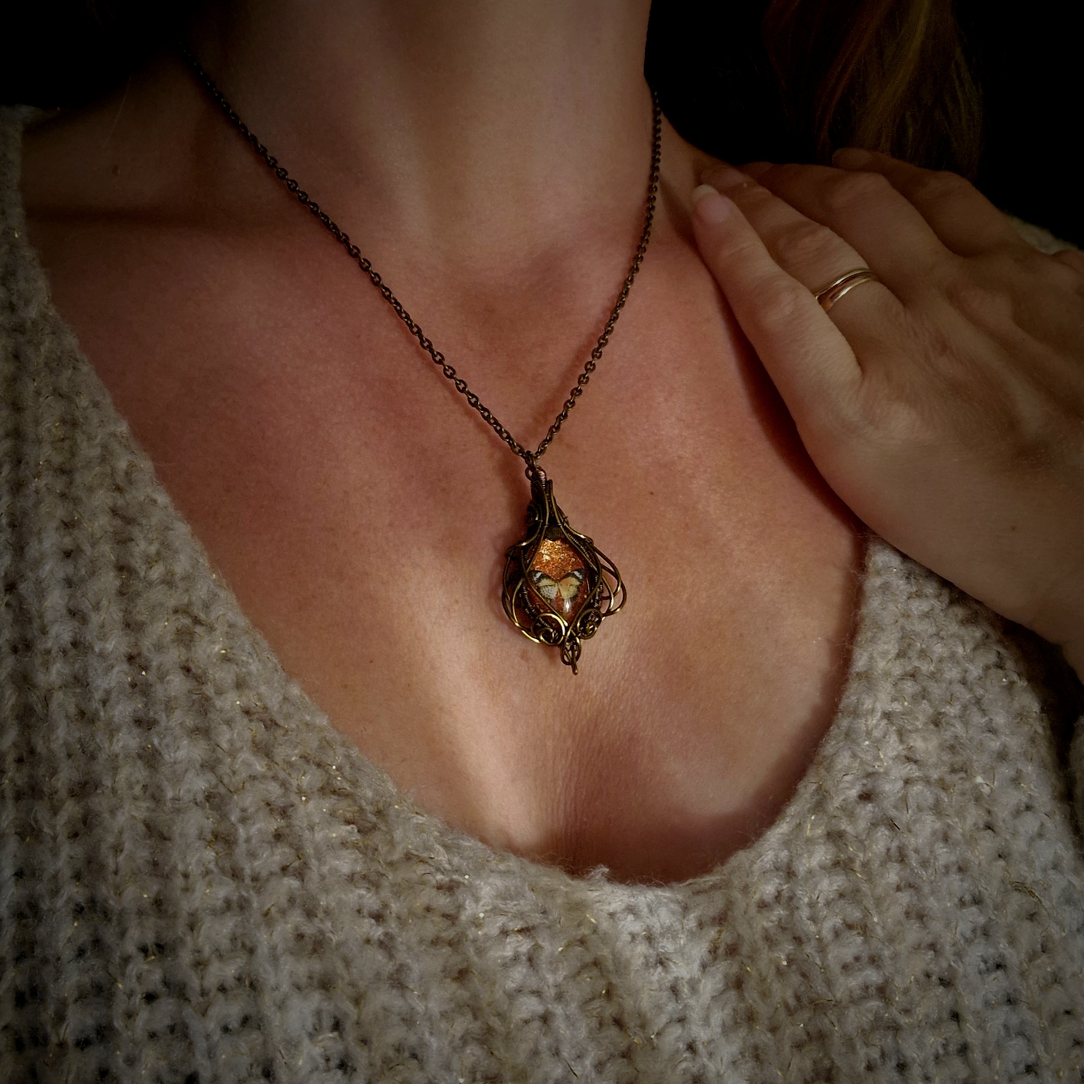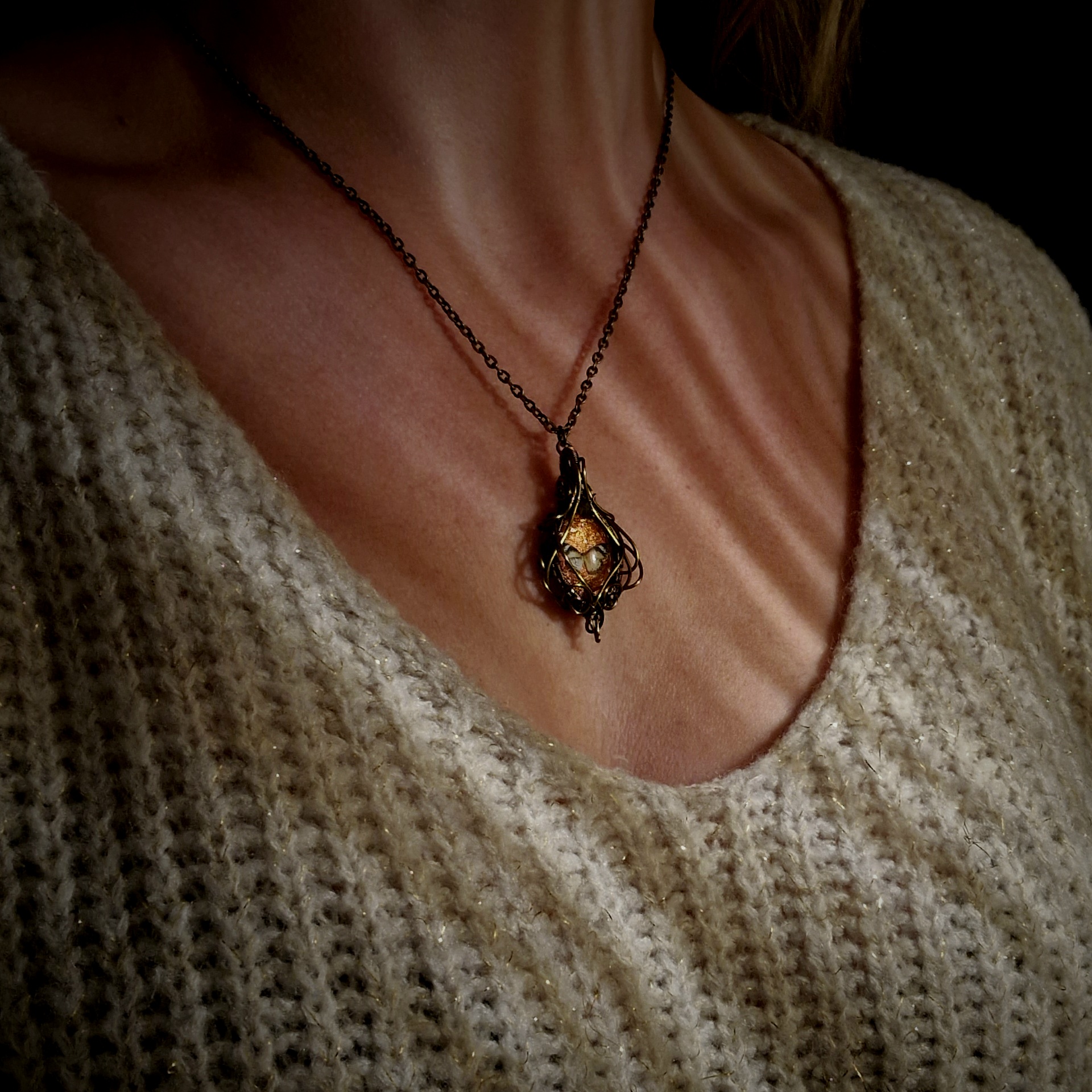 • Entourage en fils de cuivre vernis bronze antique. Ces fils sont recouverts d’un revêtement vernis anti-ternissement, ce qui assurera à votre bijou une meilleure résistance au temps.