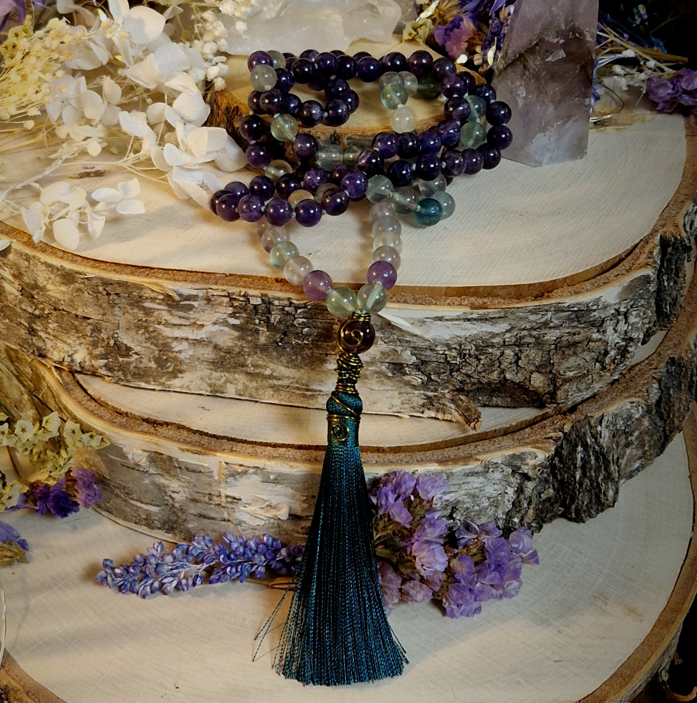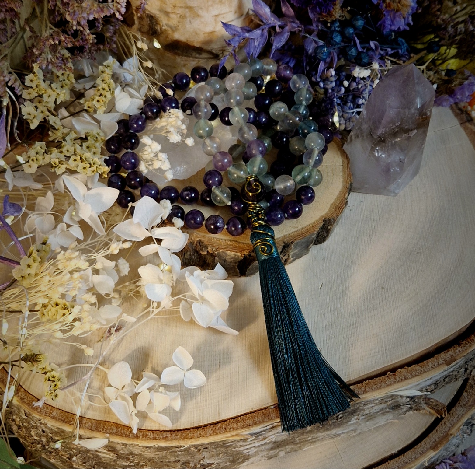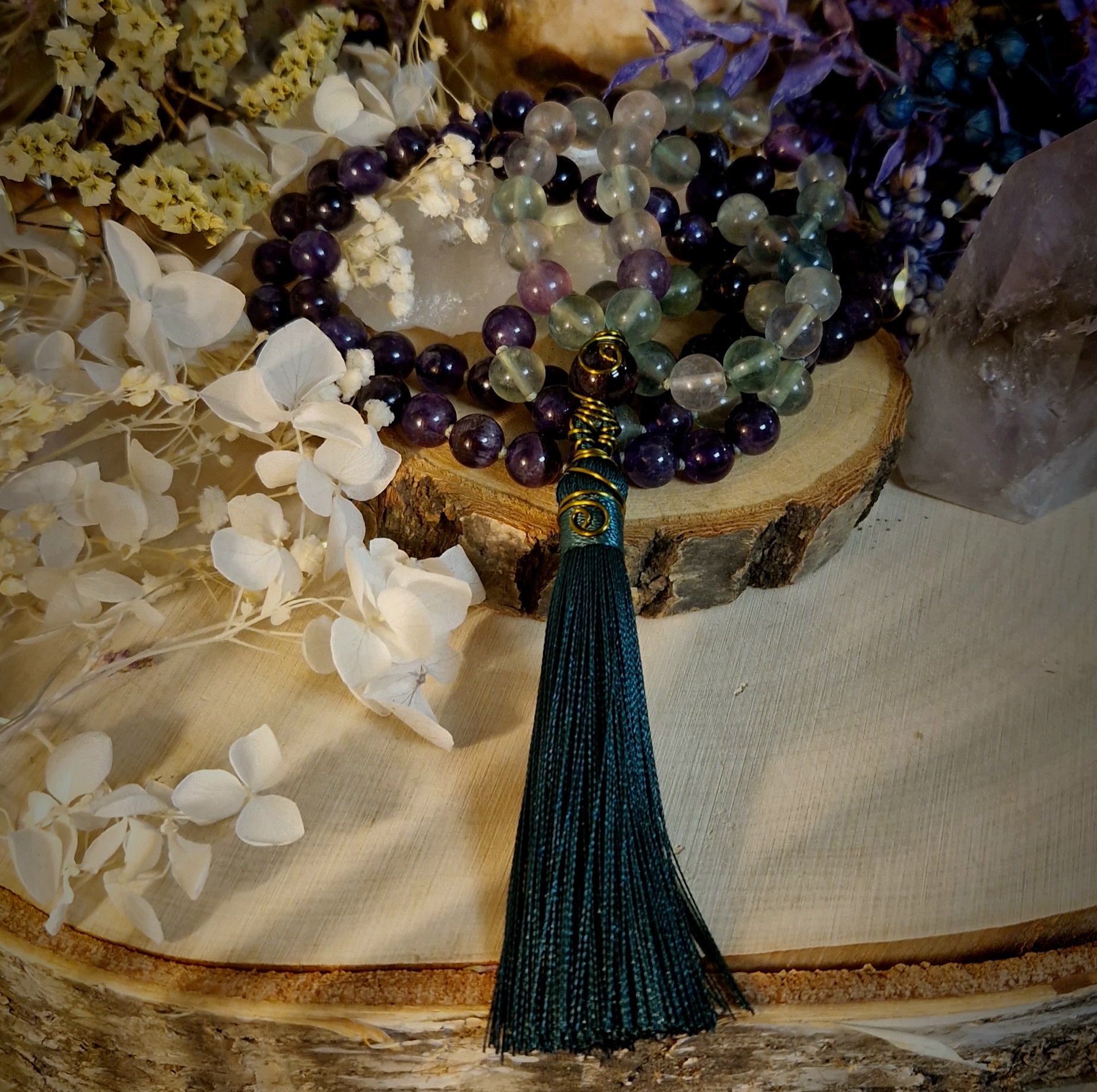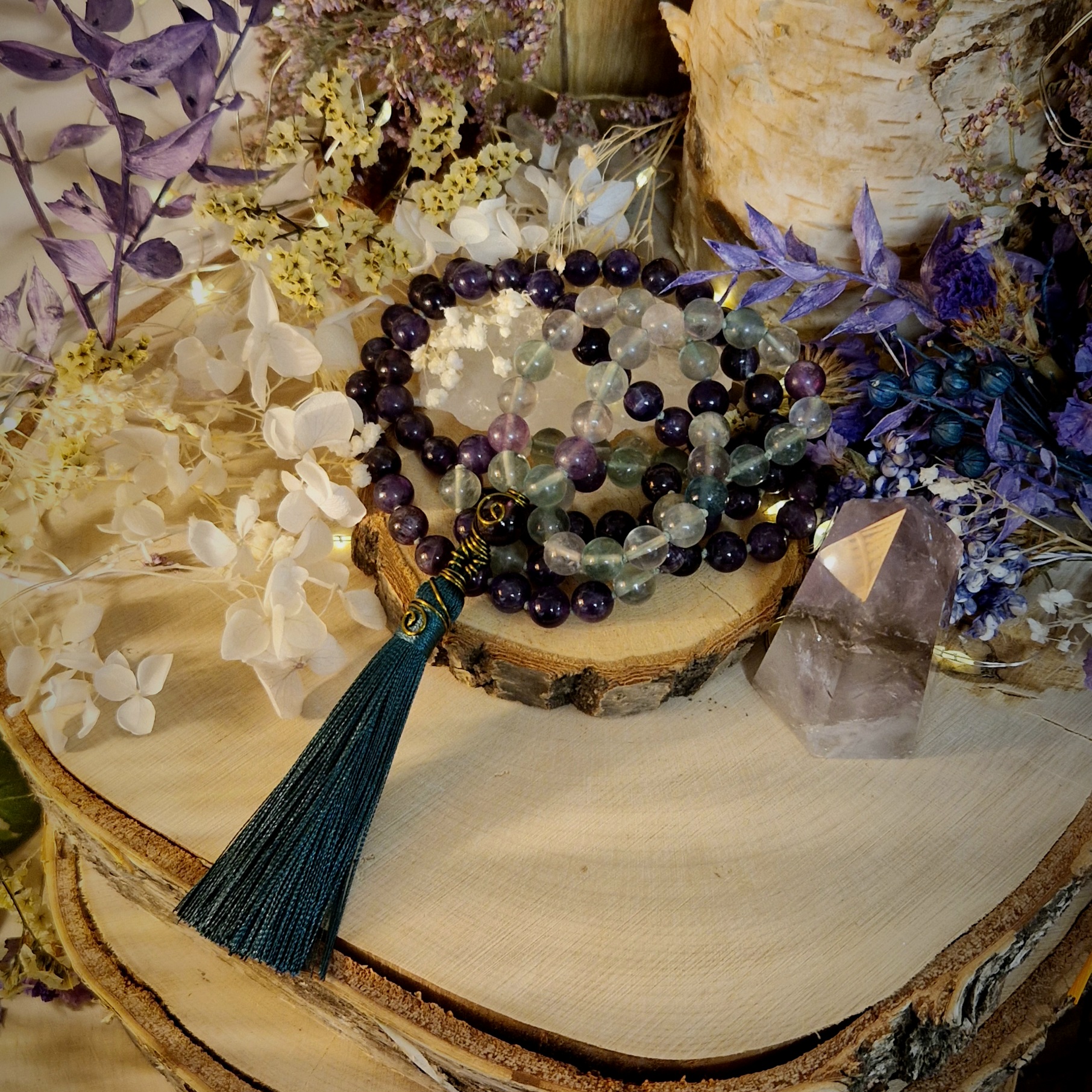 Plongez dans une méditation féerique grâce à ce mala en fluorite et améthyste, conçu pour élever votre esprit et harmoniser vos énergies. Chaque perle, choisie avec soin, vous enveloppera d’une aura de sérénité, exacerbant ainsi votre intuition et clarifiant votre esprit, guidant votre âme vers un équilibre spirituel profond.