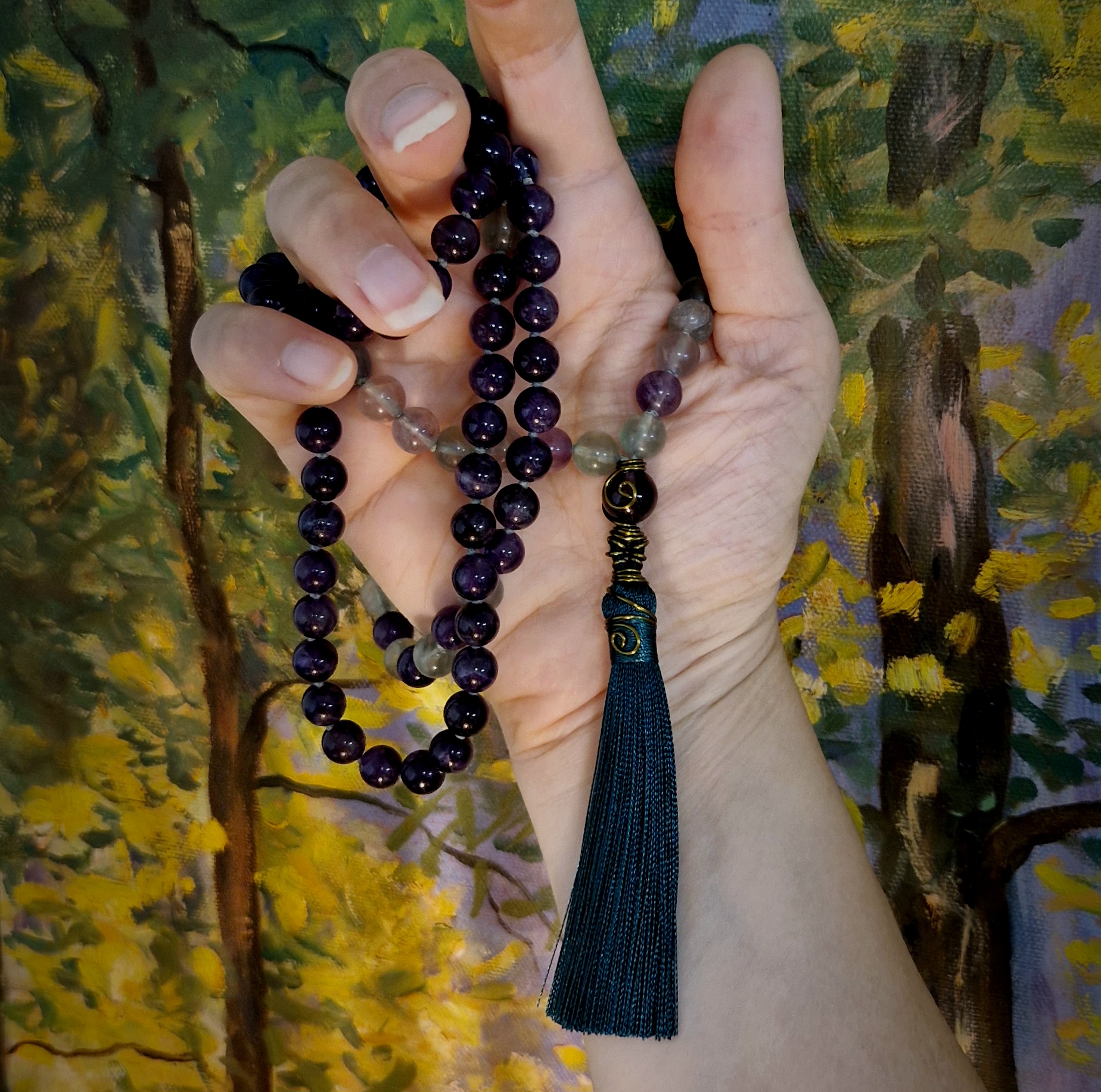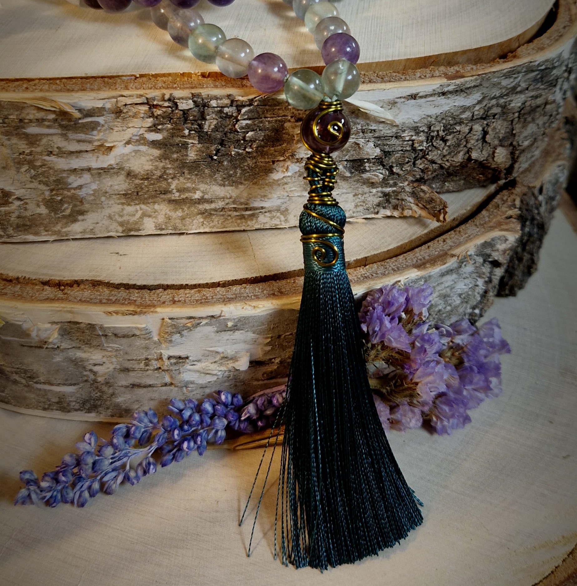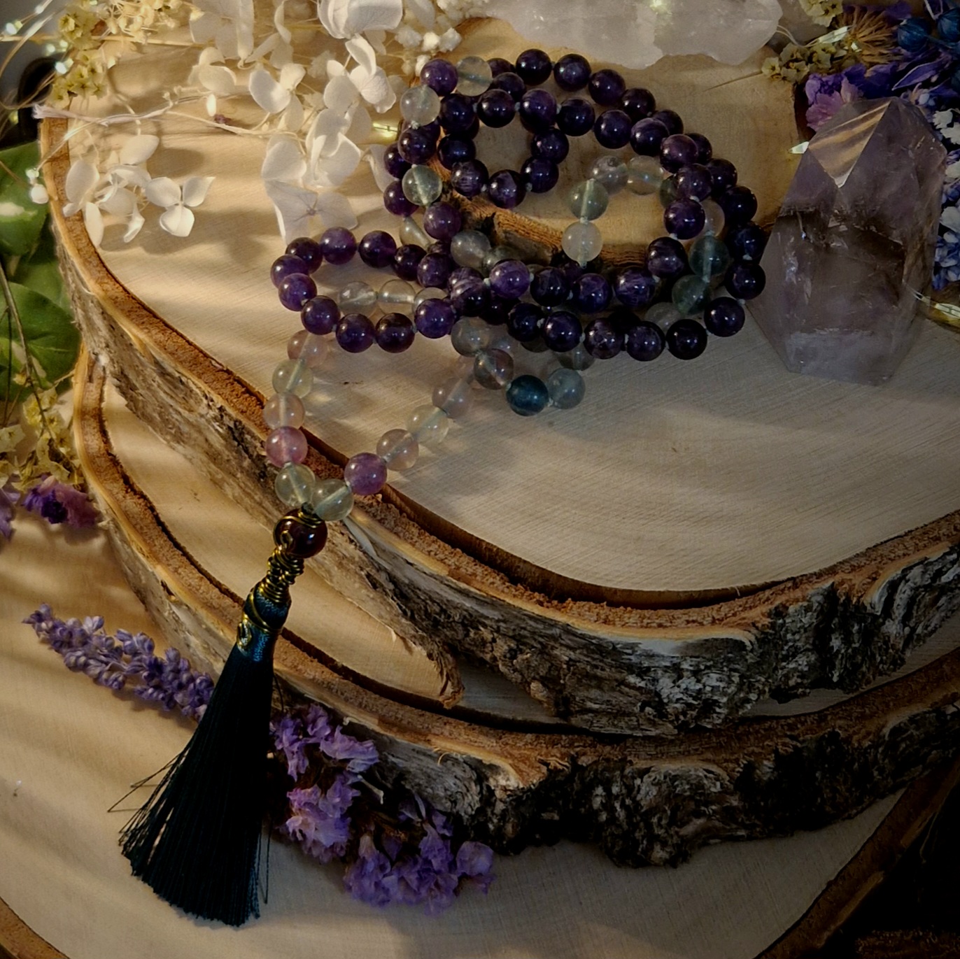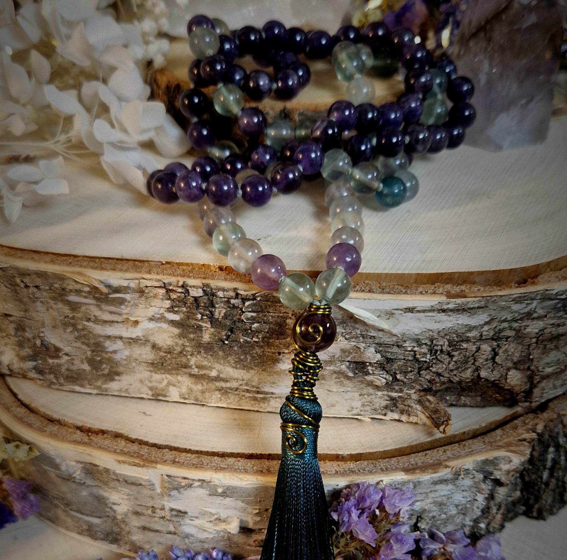 Plongez dans une méditation féerique grâce à ce mala en fluorite et améthyste, conçu pour élever votre esprit et harmoniser vos énergies. Chaque perle, choisie avec soin, vous enveloppera d’une aura de sérénité, exacerbant ainsi votre intuition et clarifiant votre esprit, guidant votre âme vers un équilibre spirituel profond.