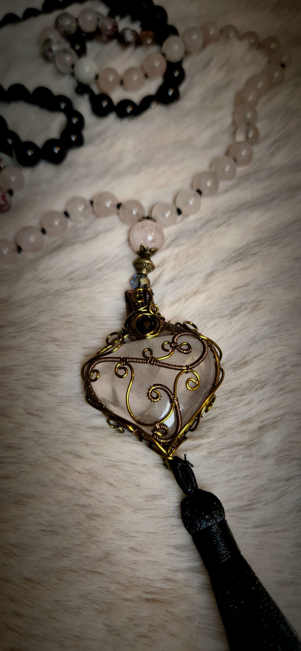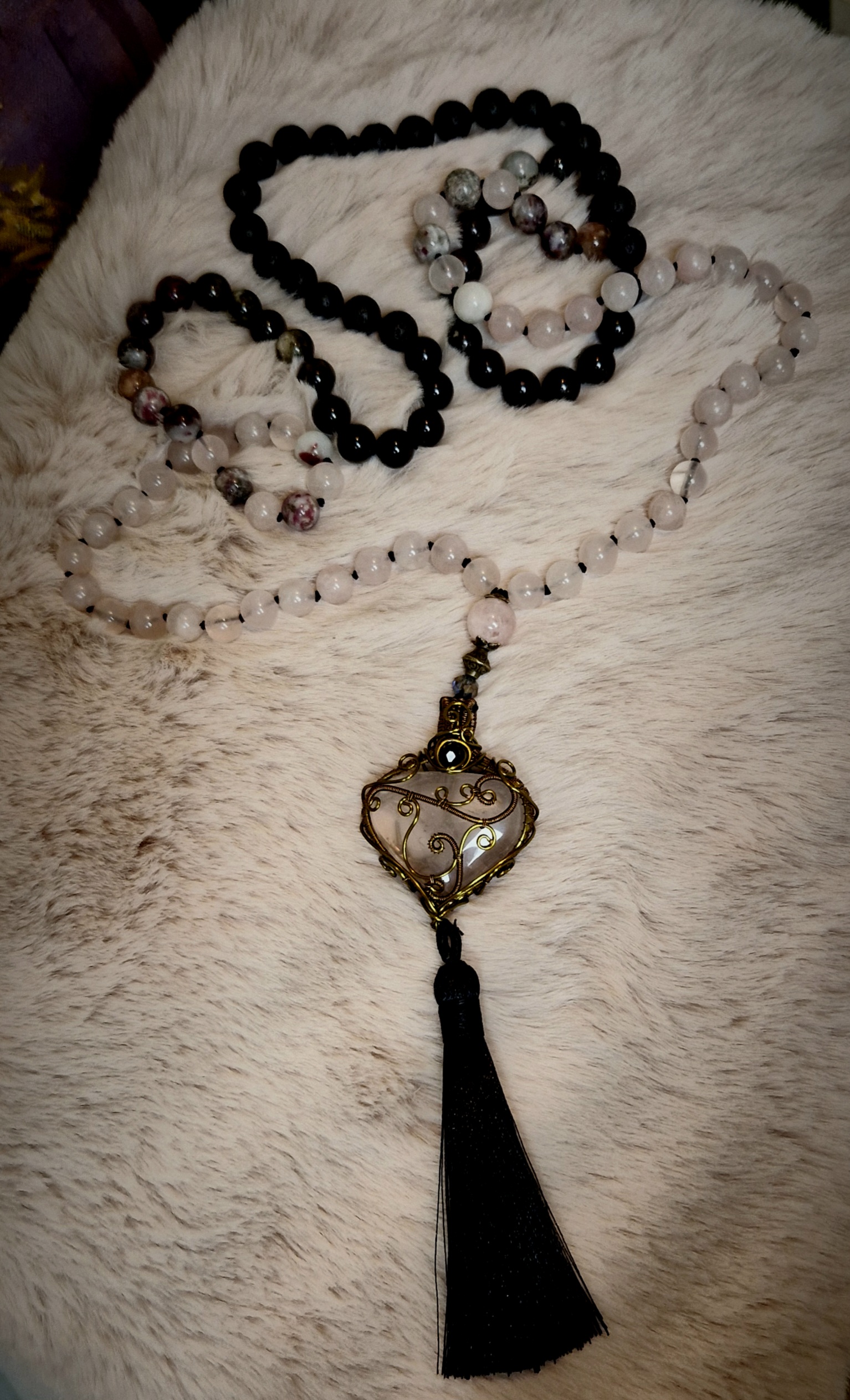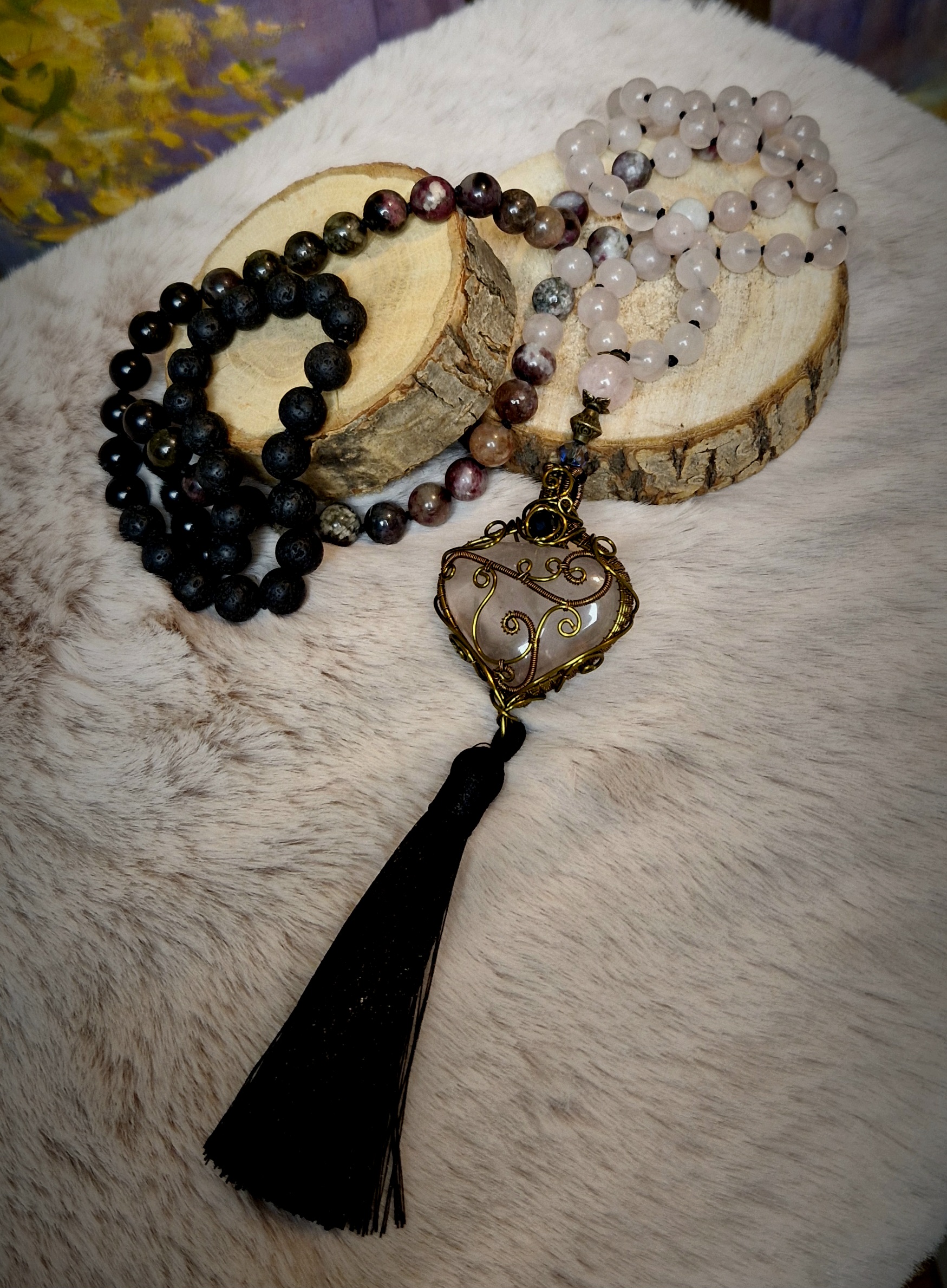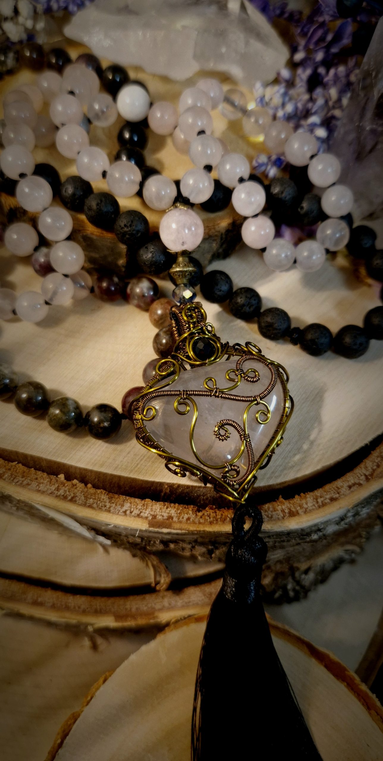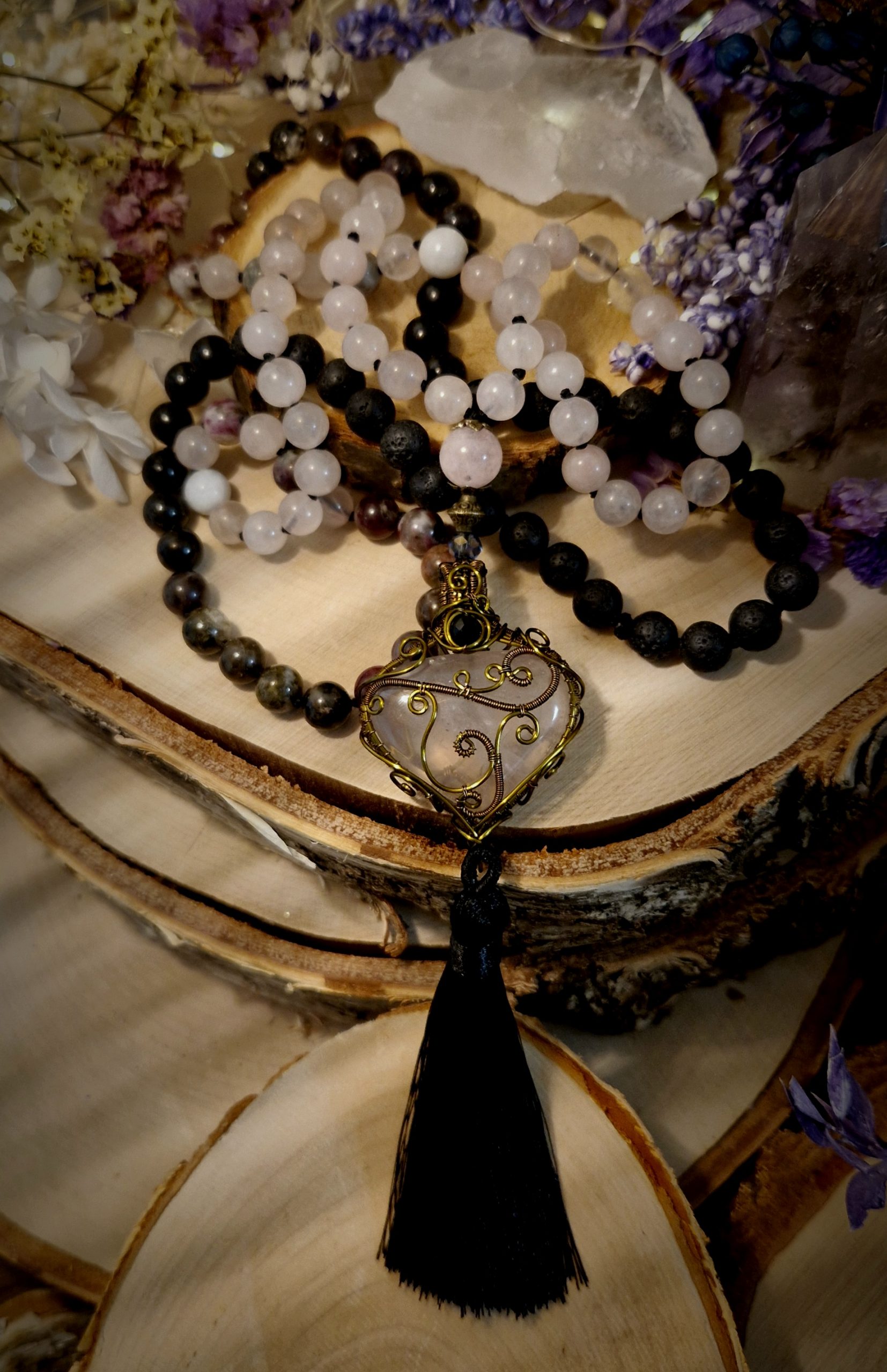 Alliez magie et spiritualité grâce à ce merveilleux mala 108 perles de pierres naturelles! Une pièce unique intégralement réalisée à la main ornée d’un grand pendentif en quartz rose dont les motifs sont inspirés de l’Anahata, le chakra du coeur. Laissez-vous guider par sa puissante énergie qui éveillera l’énergie du coeur et favorisera votre cheminement vers la sérénité et un équilibre intérieur profond.