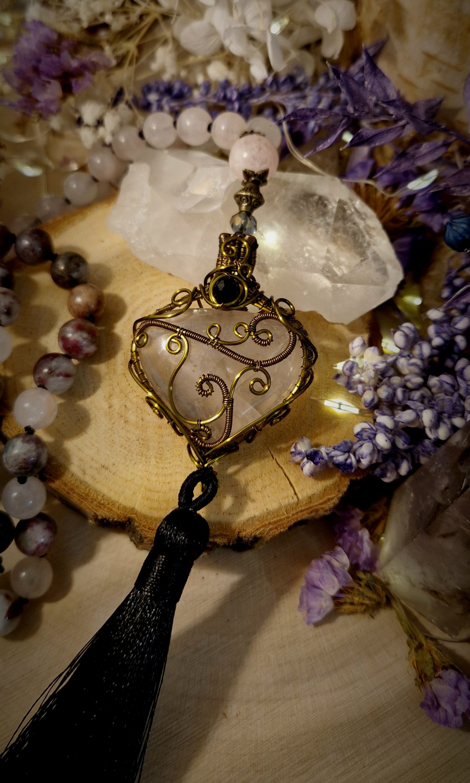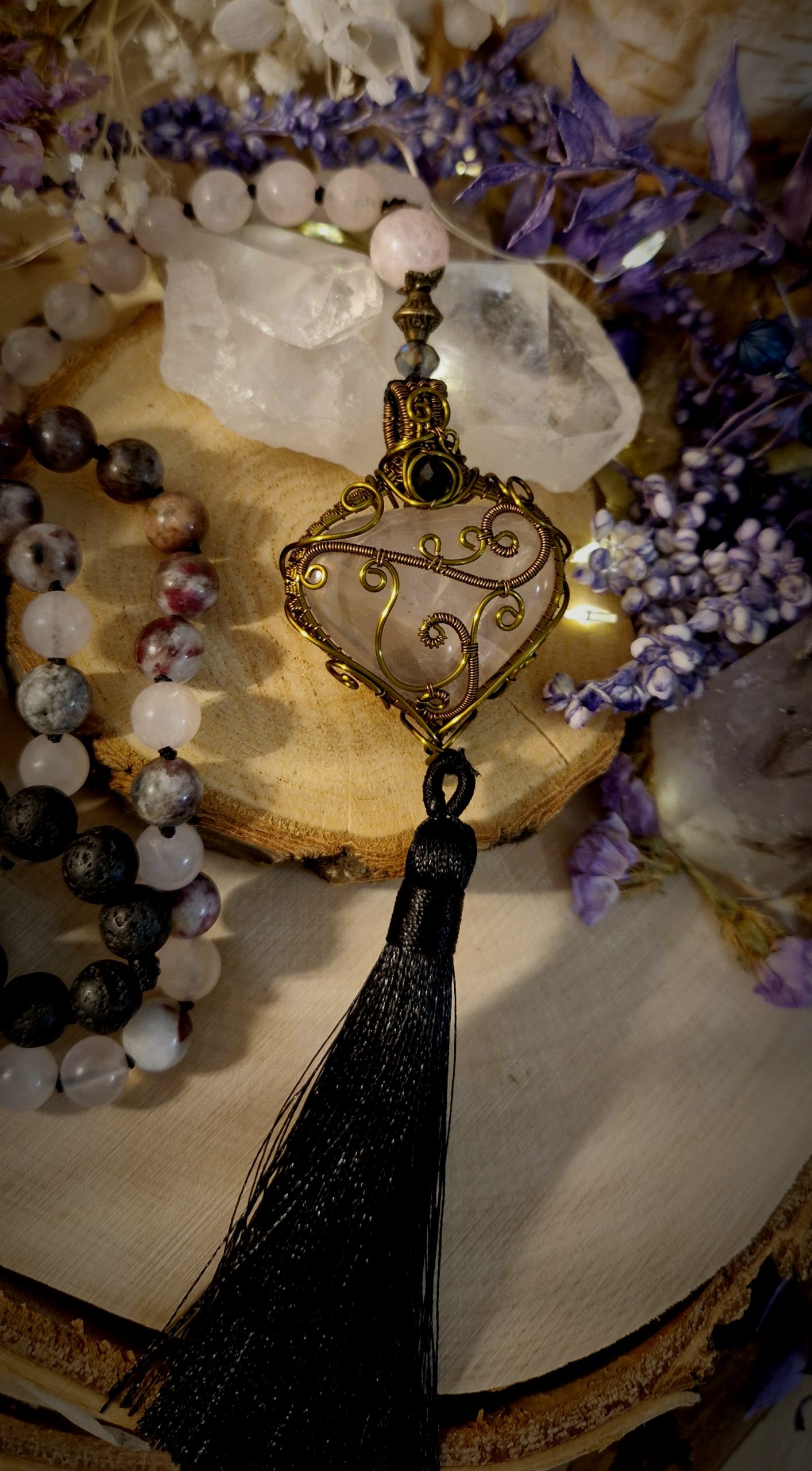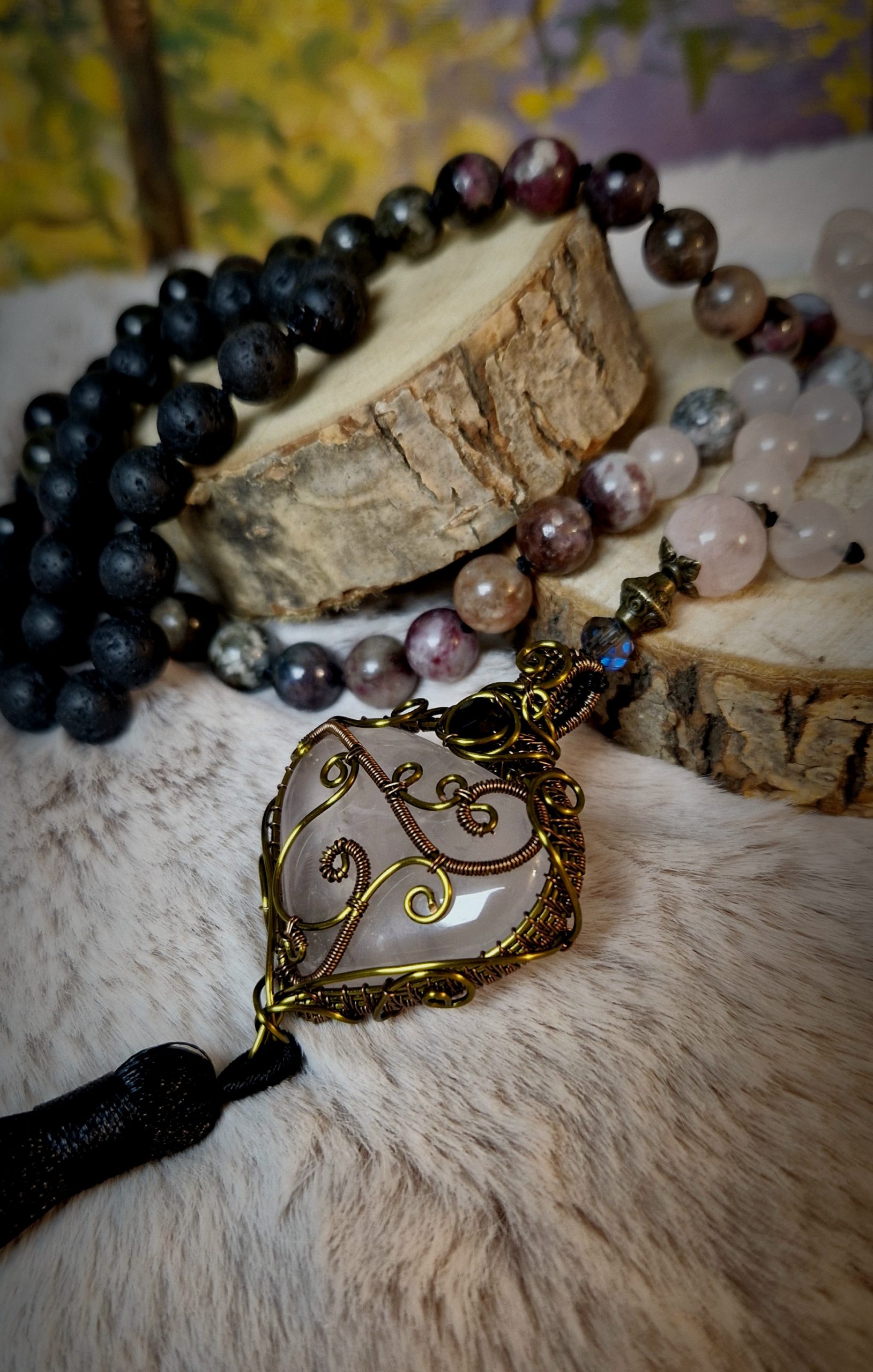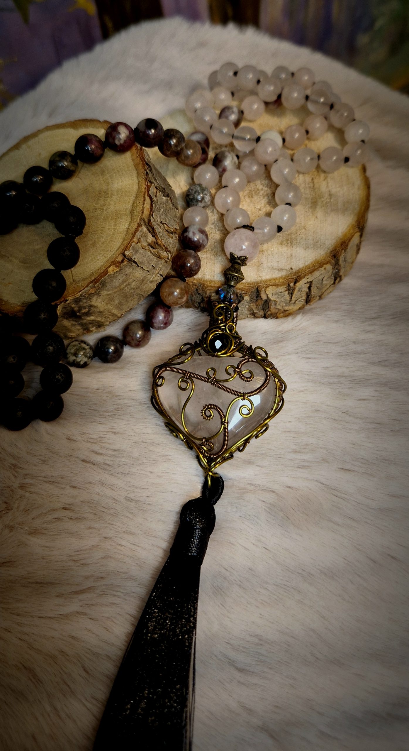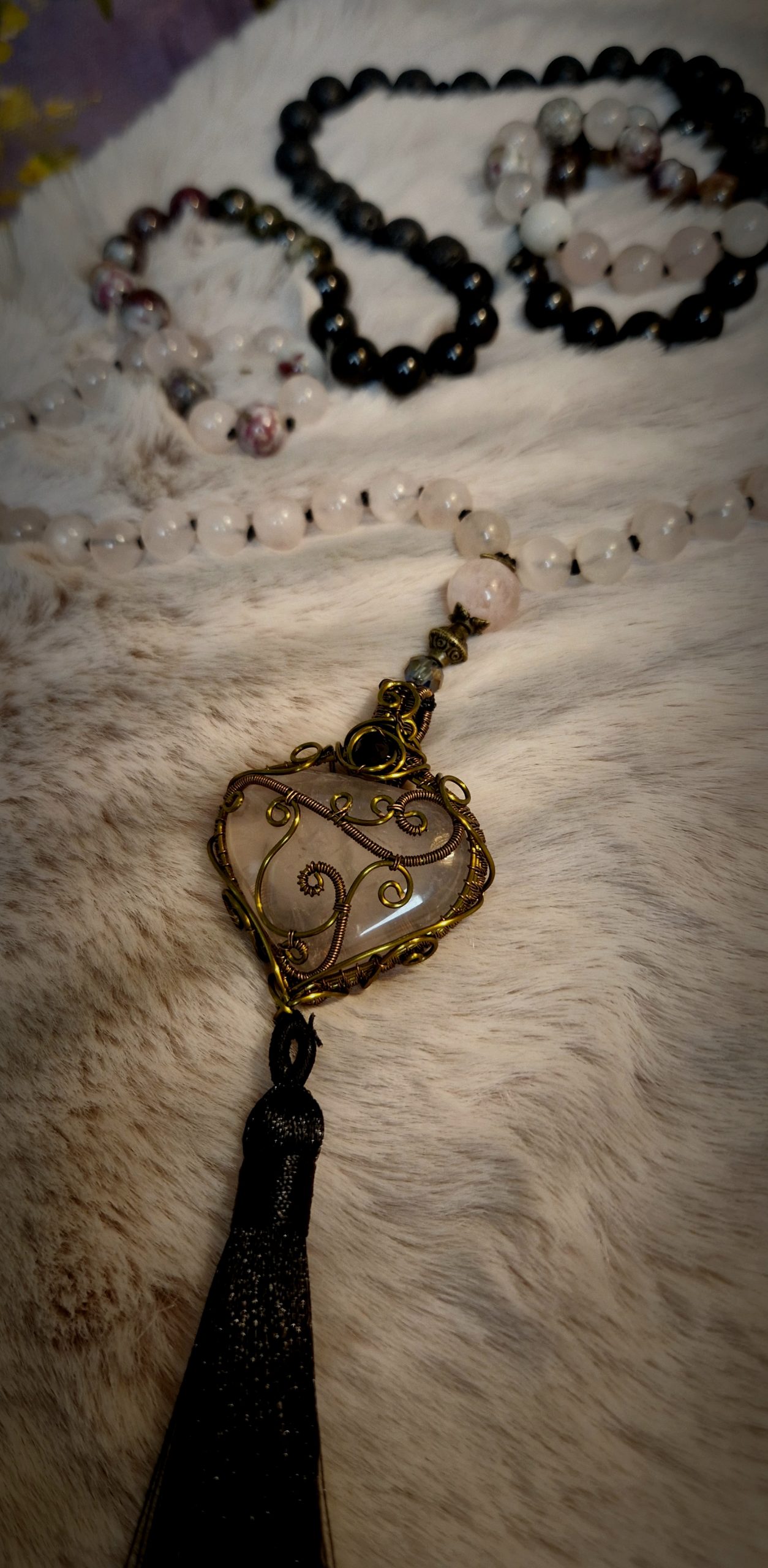 Alliez magie et spiritualité grâce à ce merveilleux mala 108 perles de pierres naturelles! Une pièce unique intégralement réalisée à la main ornée d’un grand pendentif en quartz rose dont les motifs sont inspirés de l’Anahata, le chakra du coeur. Laissez-vous guider par sa puissante énergie qui éveillera l’énergie du coeur et favorisera votre cheminement vers la sérénité et un équilibre intérieur profond.