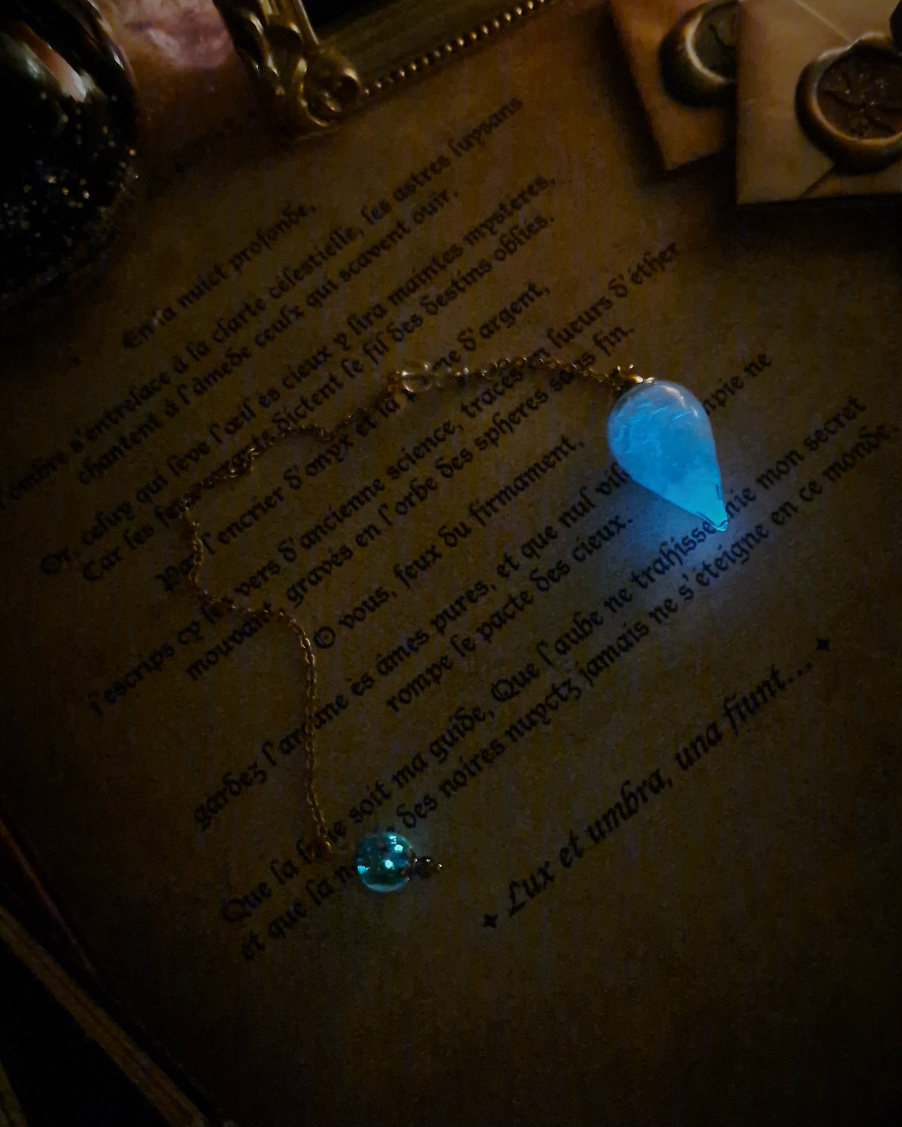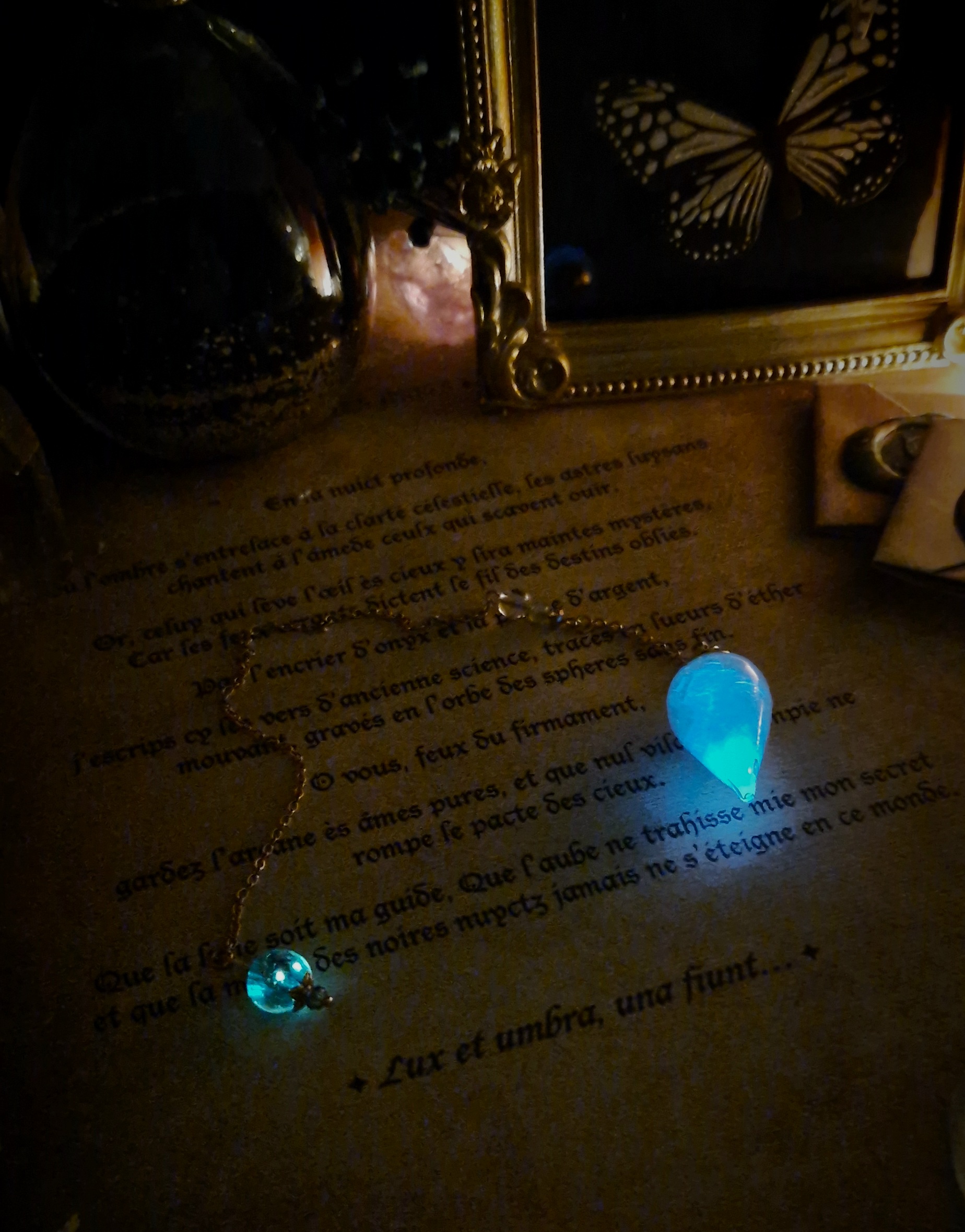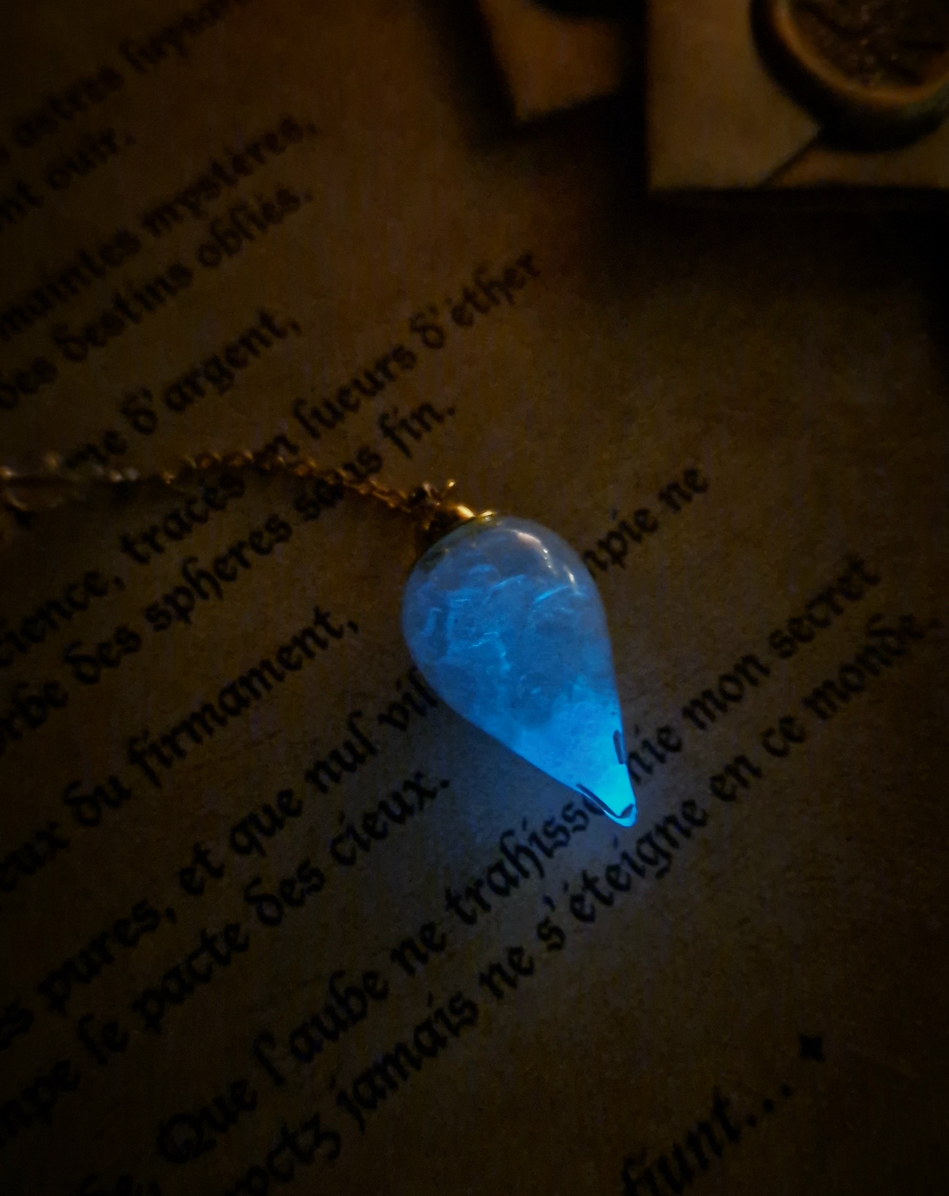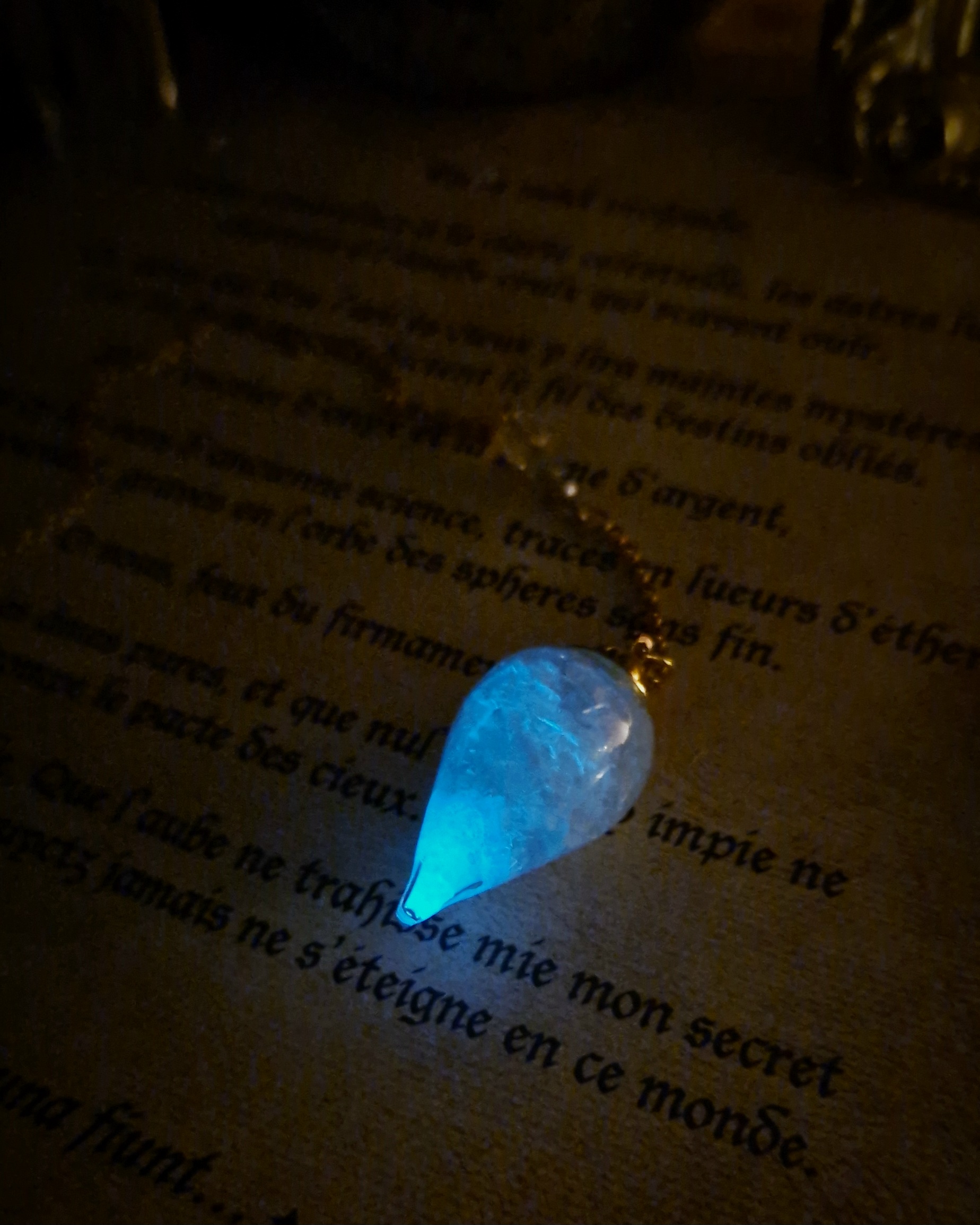 • Goutte en verre remplie d’éclats de calcite verte et de poussière luminescente, scellée par une petite coupelle en métal doré.