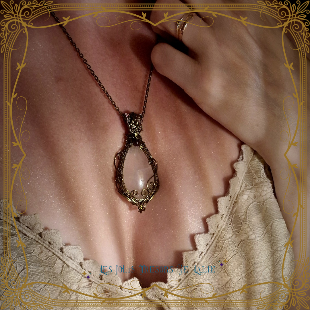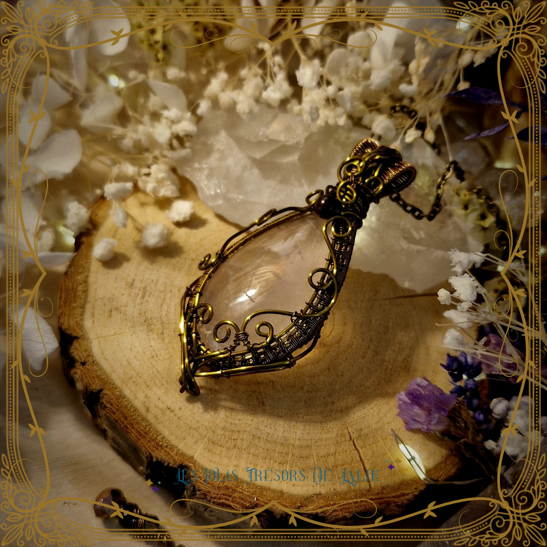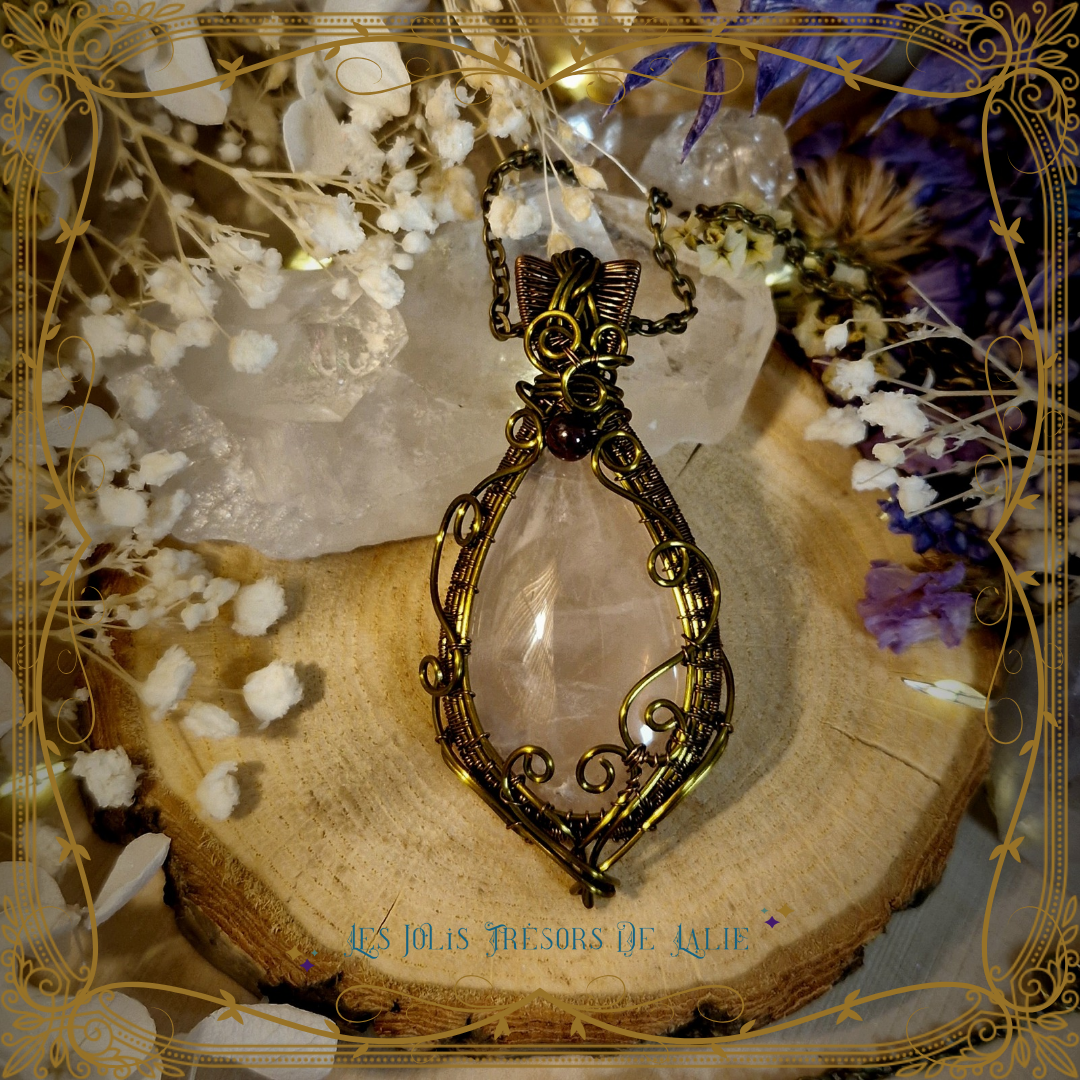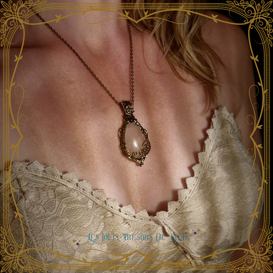 Laissez-vous envoûter par ce grand collier bronze antique en quartz rose inspiré par Célaino, la poétesse du clan des amazones. Chargé du pouvoir de l’amour, ce bijou féerique et symbolique en pierres naturelles, créé main, sublimera votre style avec une touche de magie et de tendresse.