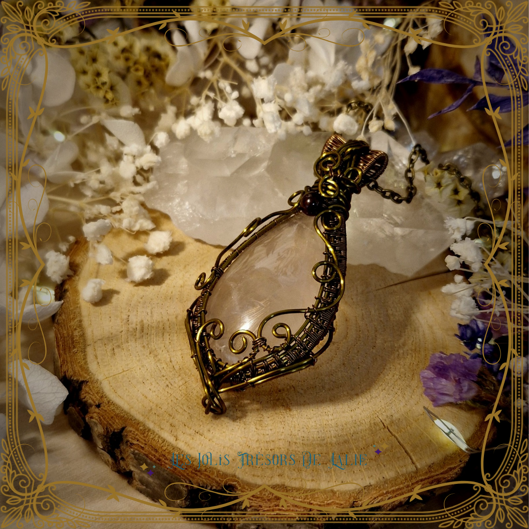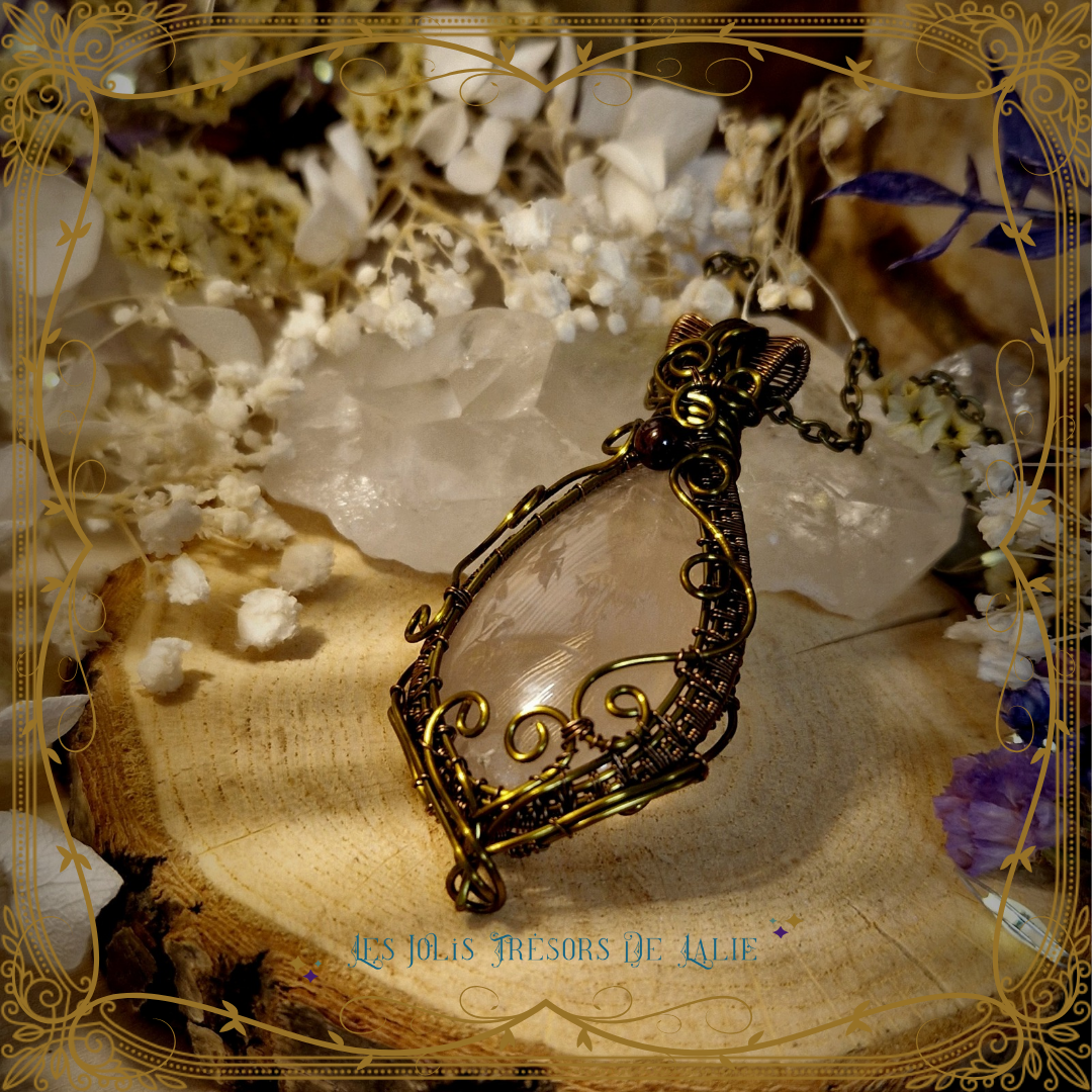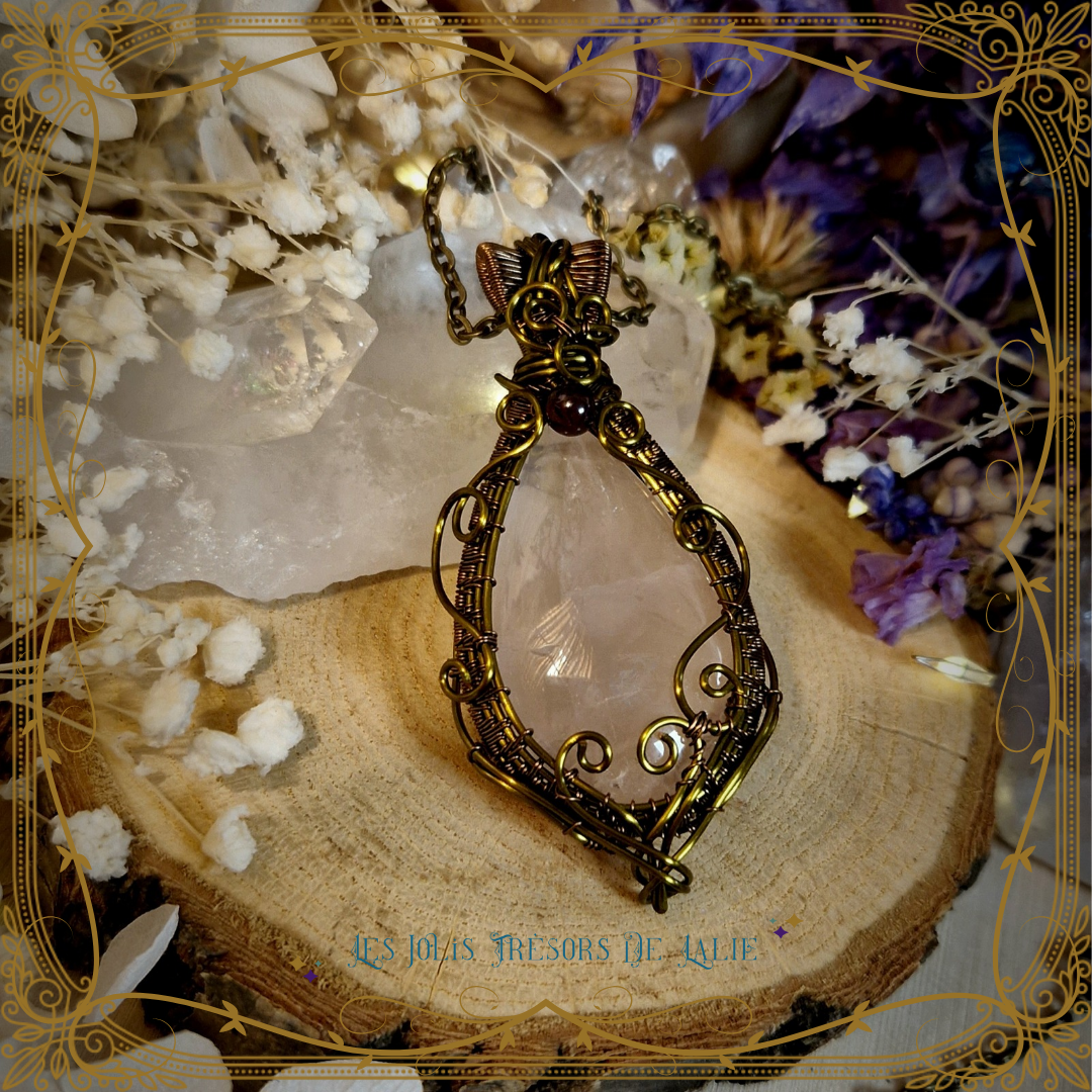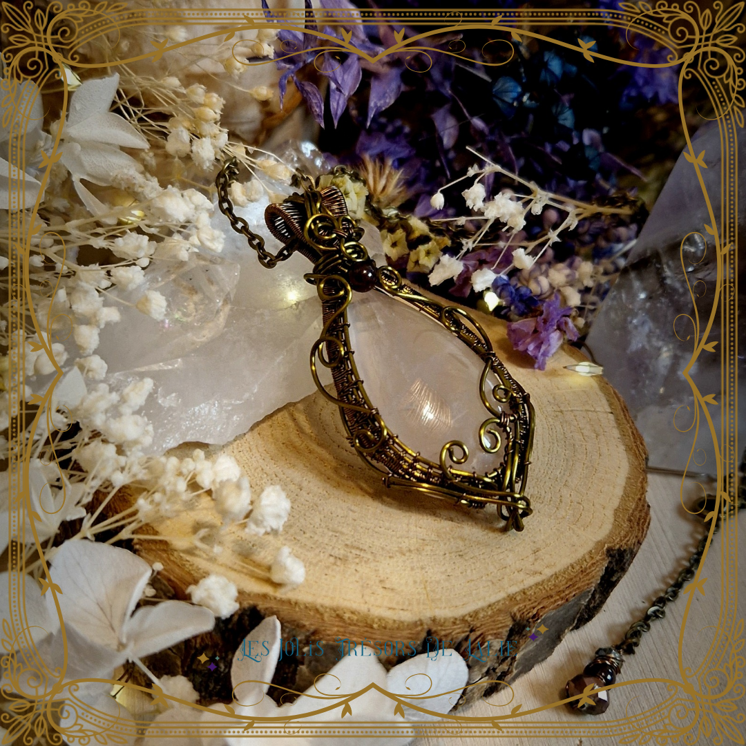Laissez-vous envoûter par ce grand collier bronze antique en quartz rose inspiré par Célaino, la poétesse du clan des amazones. Chargé du pouvoir de l’amour, ce bijou féerique et symbolique en pierres naturelles, créé main, sublimera votre style avec une touche de magie et de tendresse.