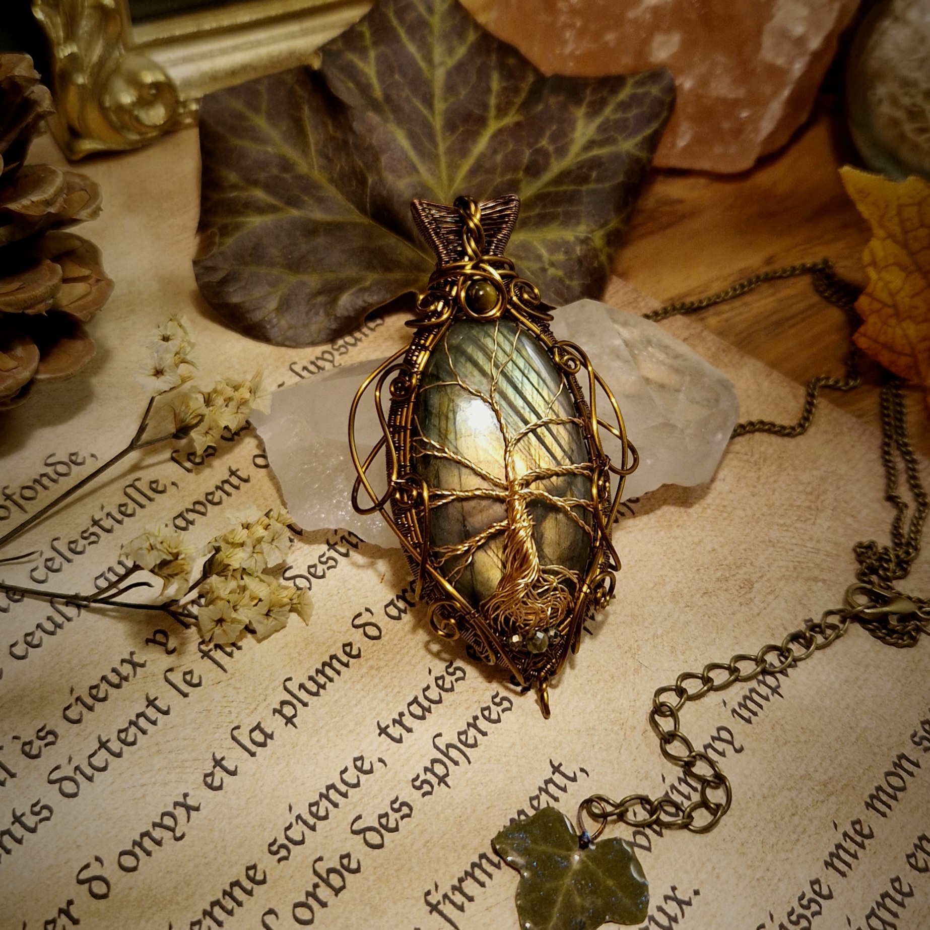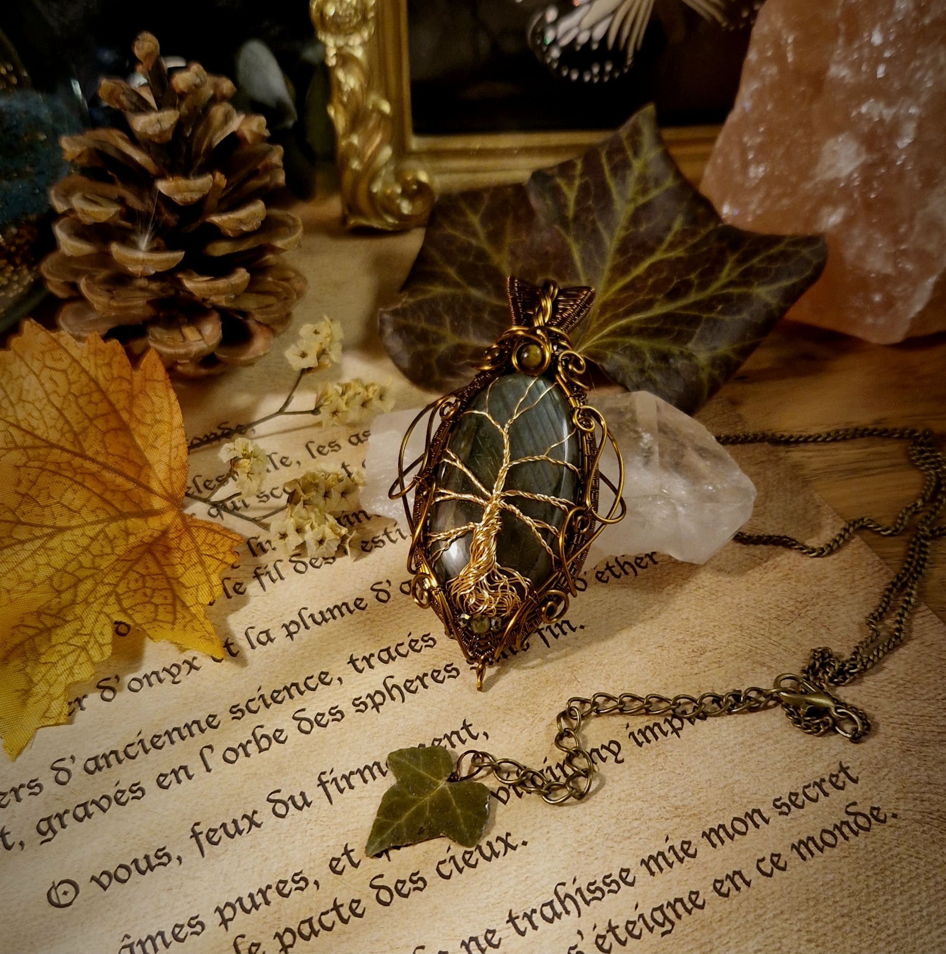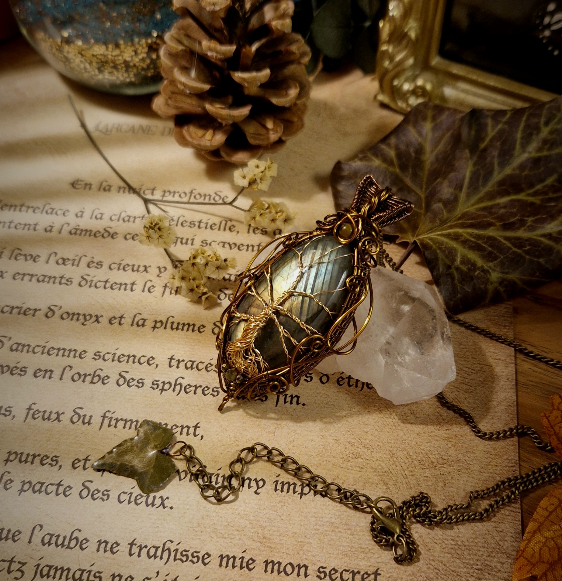 • Descriptif: Pierres naturelles labradorite & perles d’œil de tigre, tourmaline et pyrite, serti fils de cuivre vernis bronze antique, arbre de vie en fils de cuivre vernis dorés, chaîne en métal couleur bronze antique