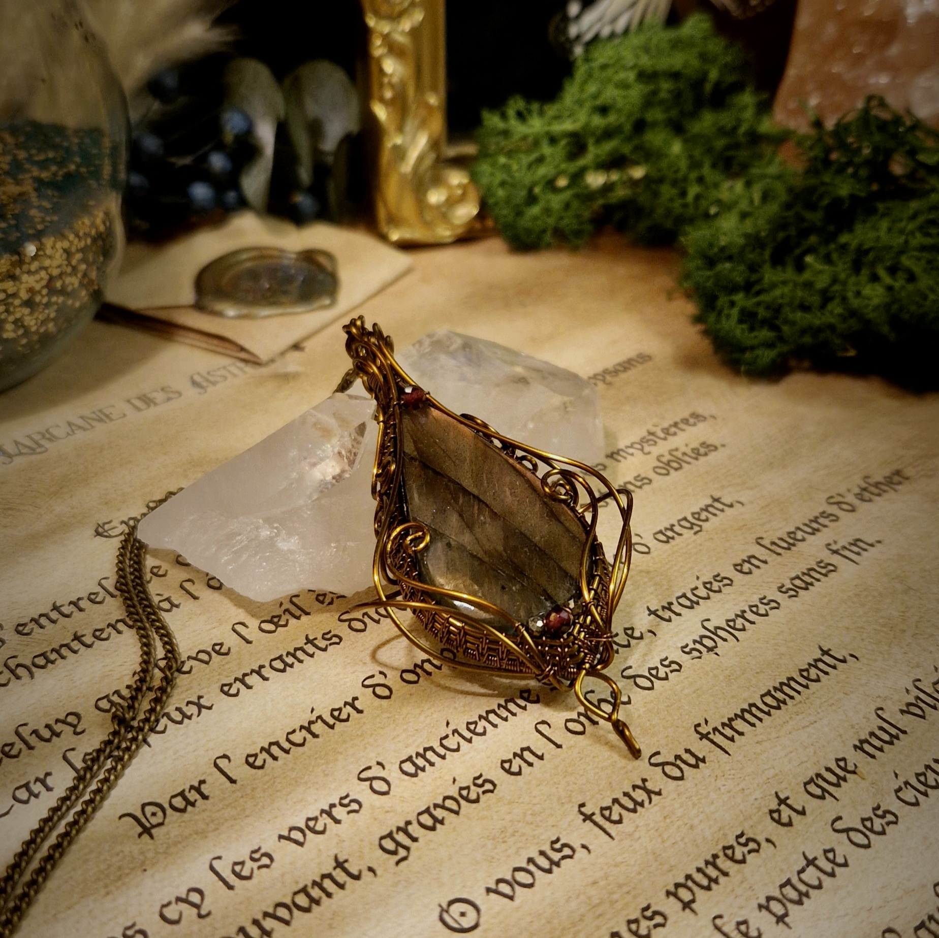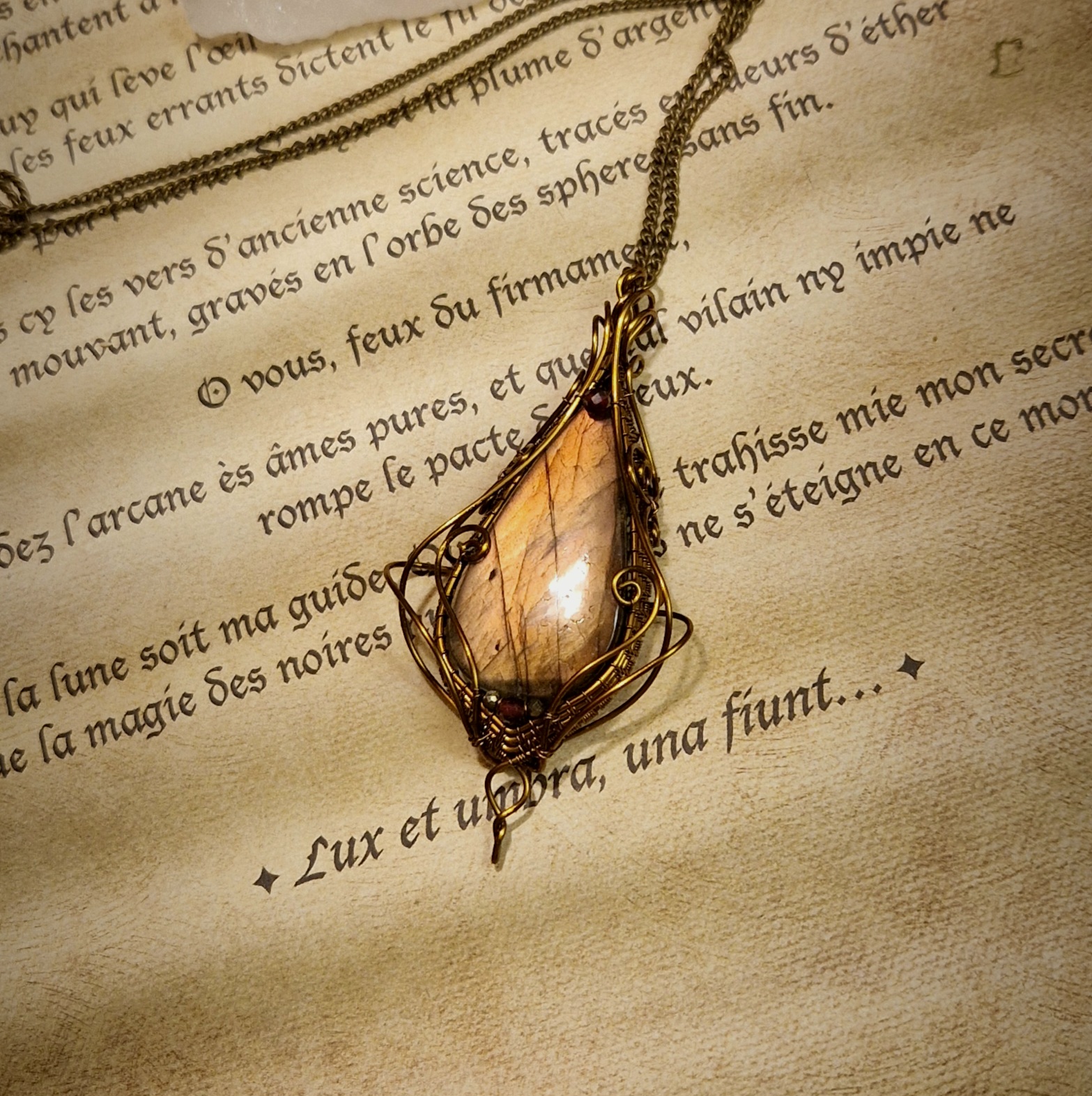 • Descriptif: Collier en pierres naturelles labradorite dorée (Provenance: Madagascar) & perles de grenat et pyrite, serti fils de cuivre vernis de couleur bronze antique, chaîne en métal de couleur bronze antique, garantie sans plomb et sans nickel