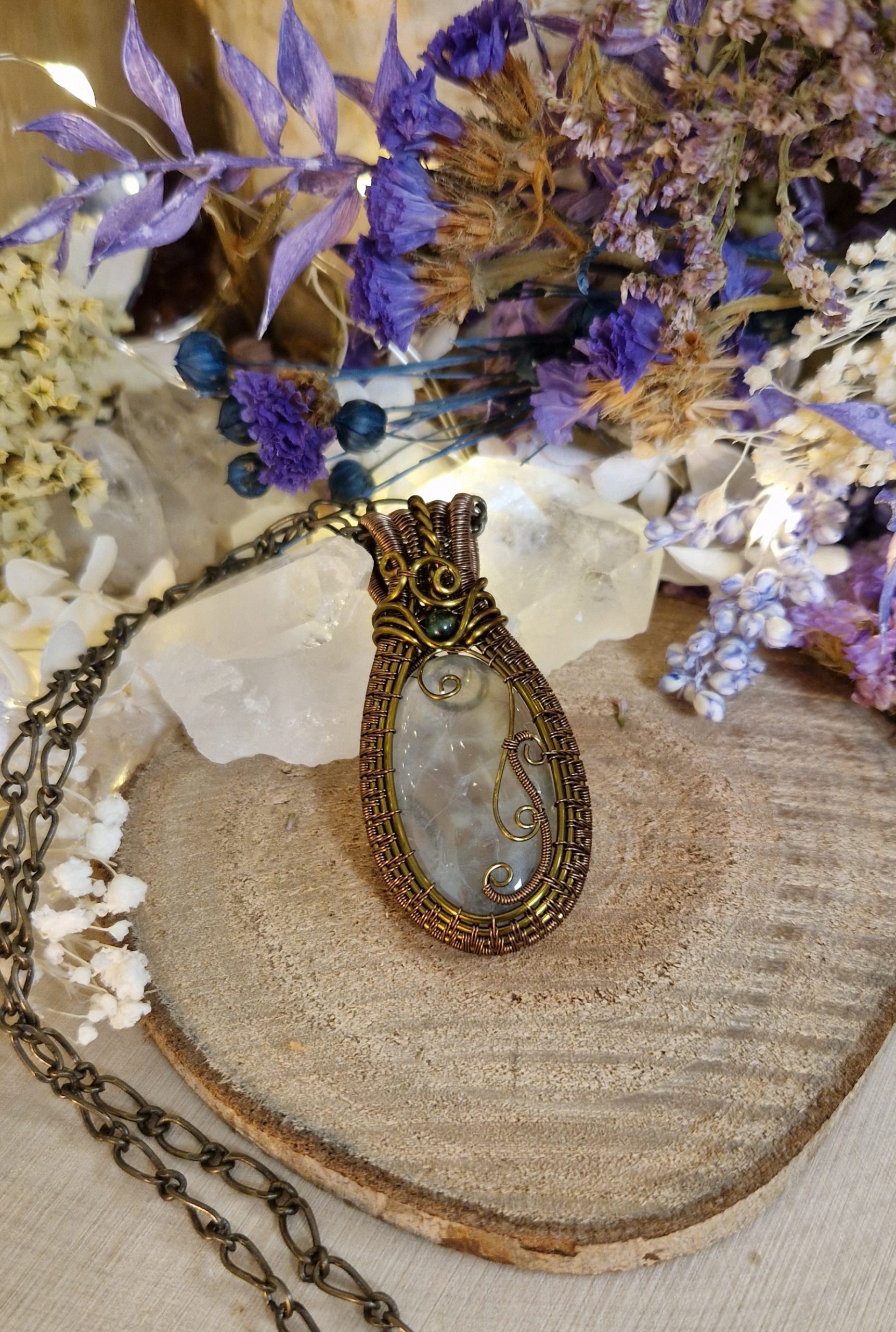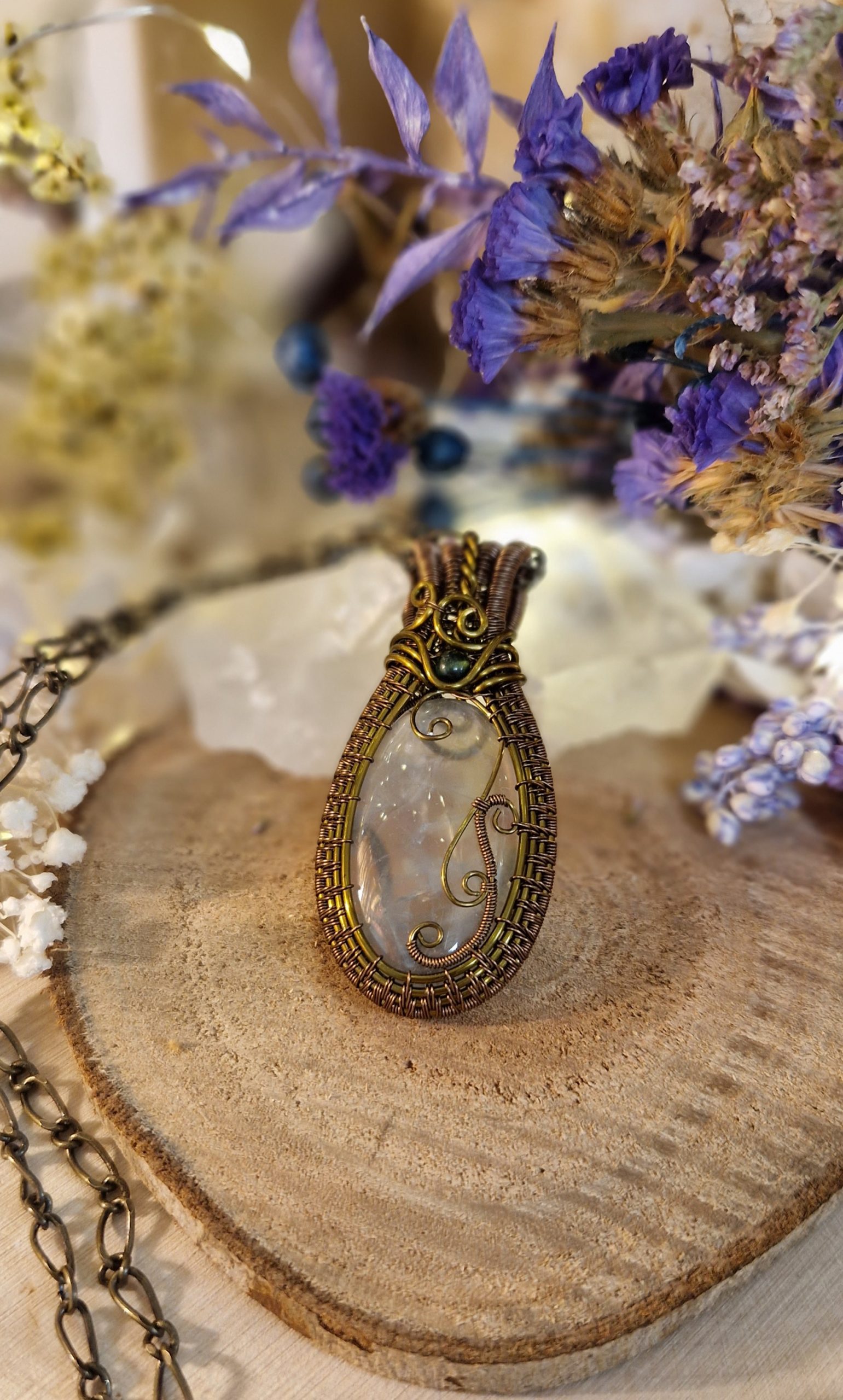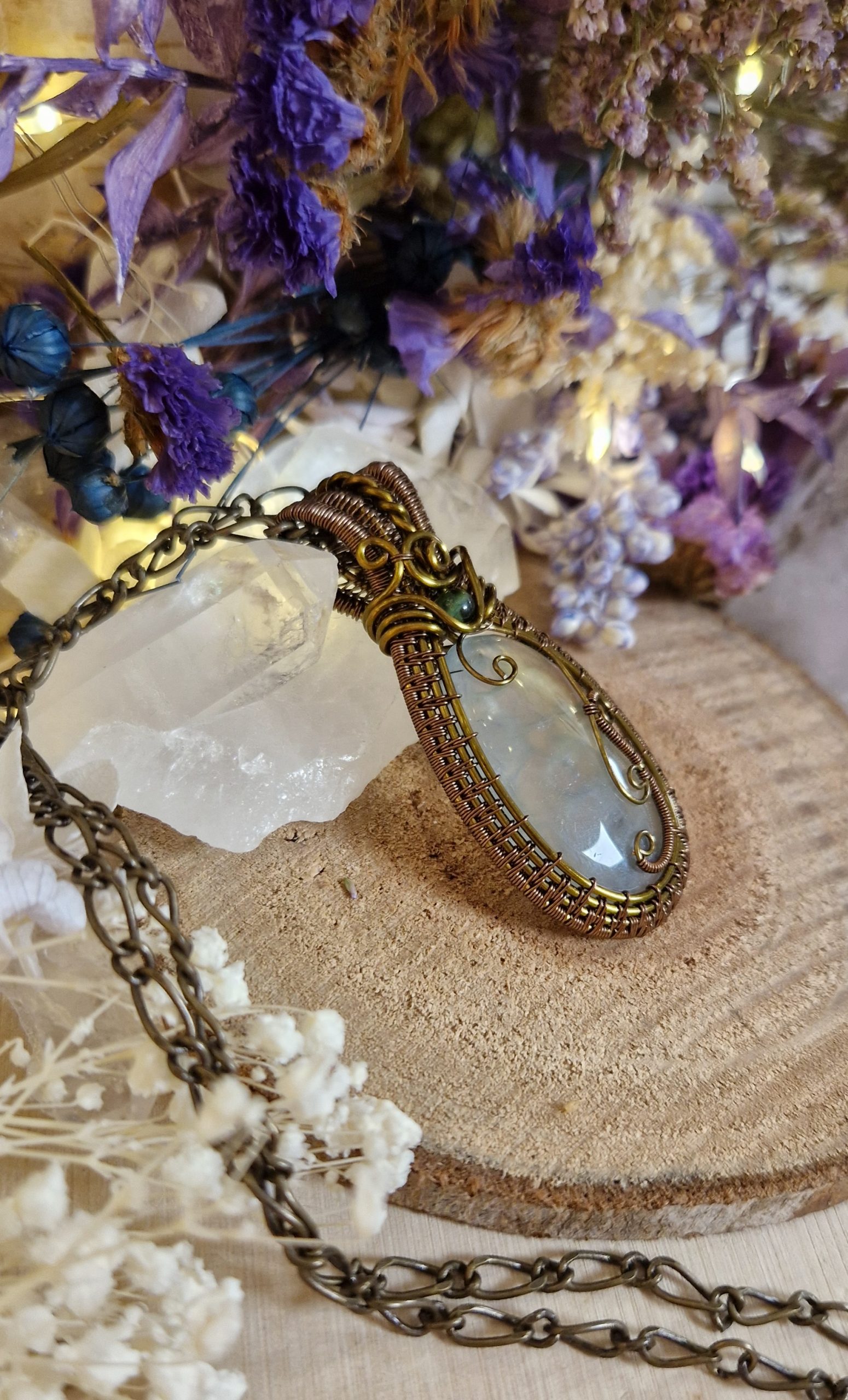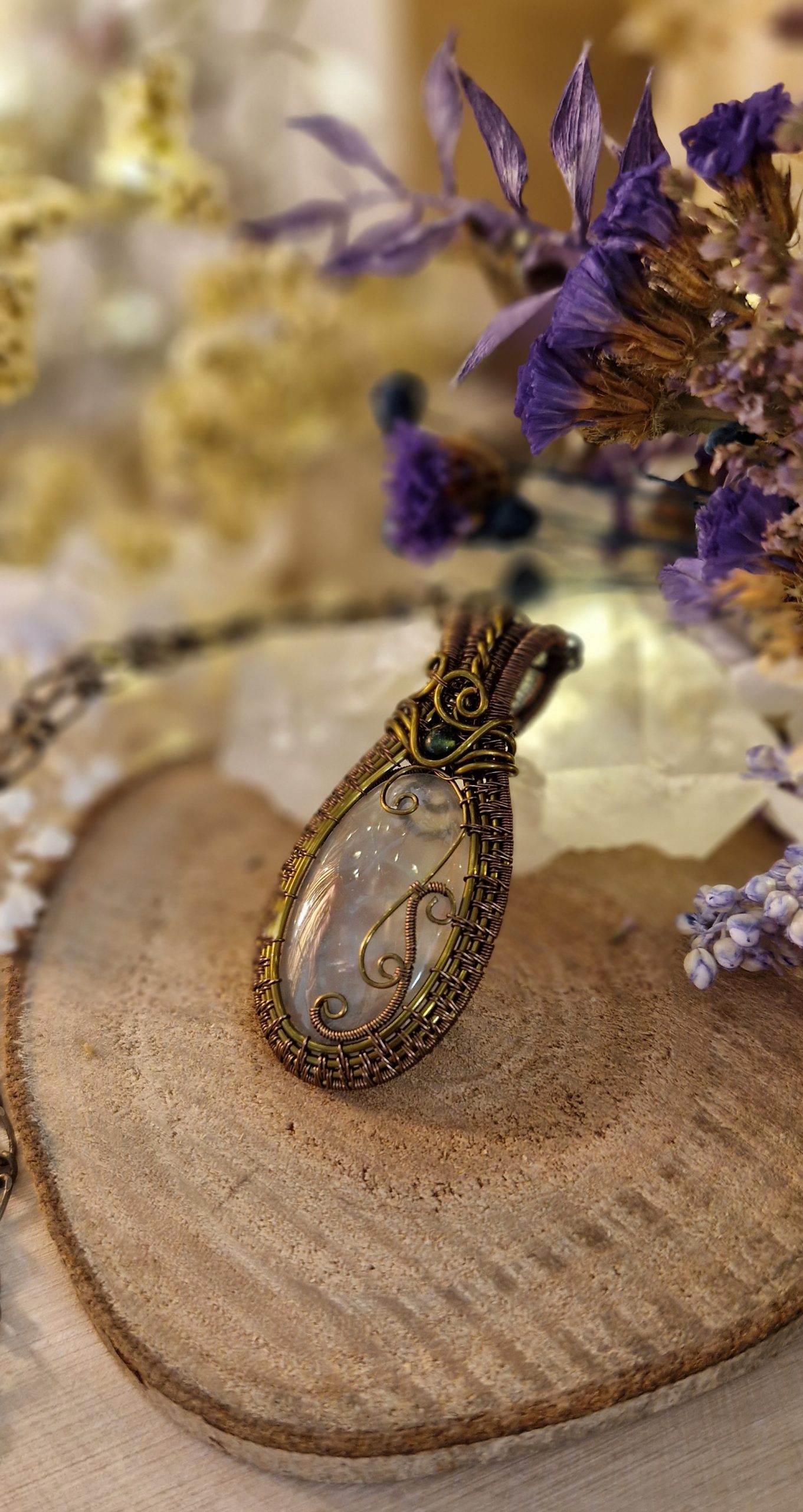 Laissez-vous envoûter par la majesté de ce grand pendentif artisanal en préhnite et enveloppez-vous de son éclat féerique! Inspiré par les légendaires amazones, ce collier de protection révèle toute sa puissance tel un bouclier magique qui vous guidera avec douceur sur le chemin de la sécurité et de l’harmonie.