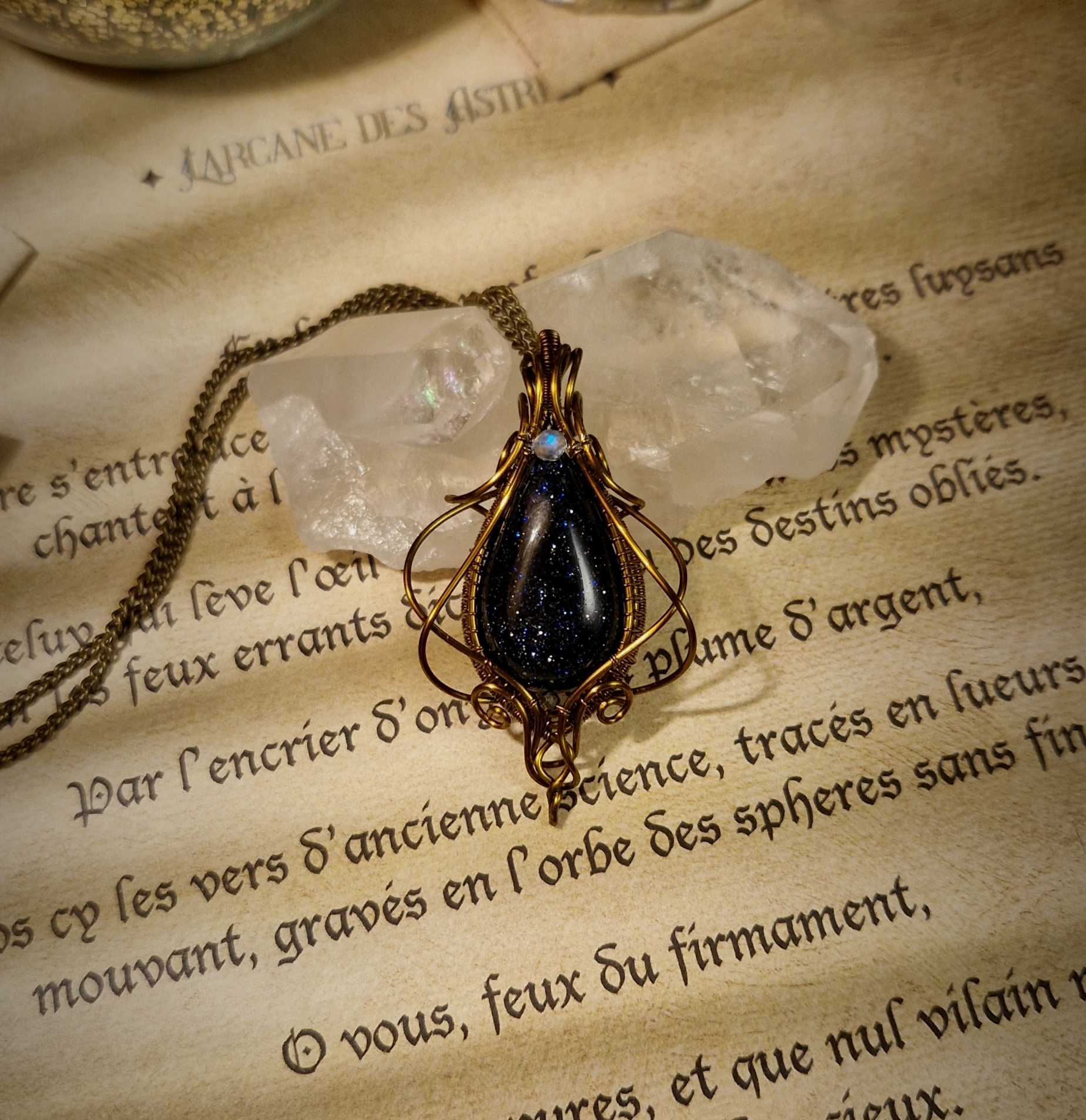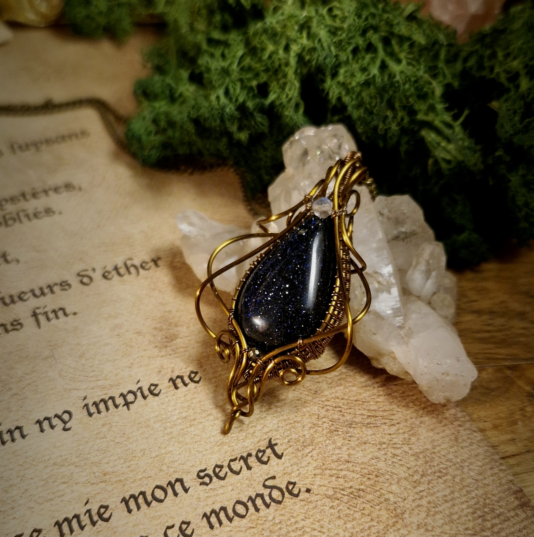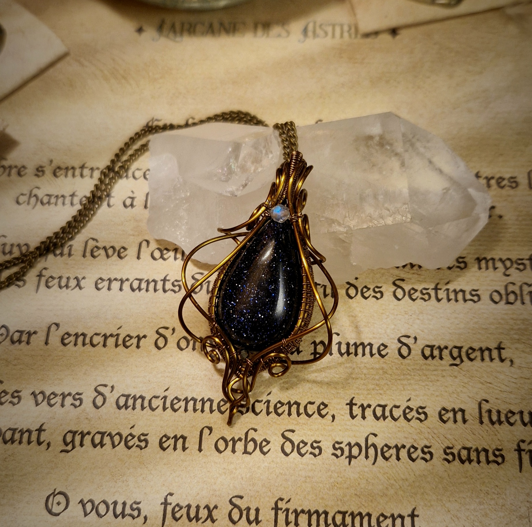 Née du savoir-faire des maîtres verriers et parsemée d’éclats scintillants tels des fragments d’étoiles, la pierre de sable bleu est une pierre synthétique créée par l’homme. Faite de verre et de cobalt ou de manganèse, elle est parsemée de milliers de micro-inclusions scintillantes de cristaux de cuivre, formés lors du refroidissement du verre, ce qui lui donne un aspect proche d’un ciel nocturne étoilé.