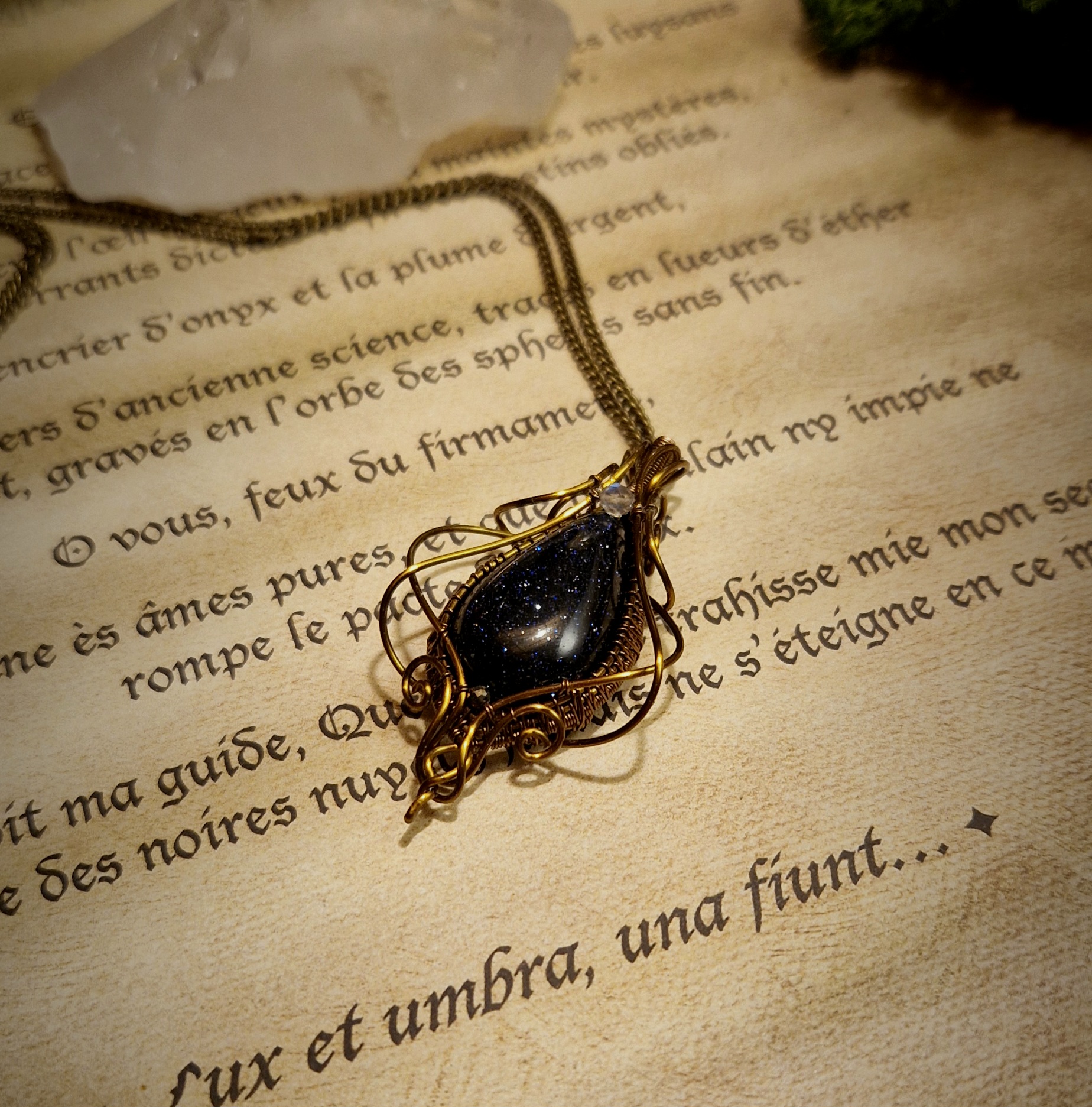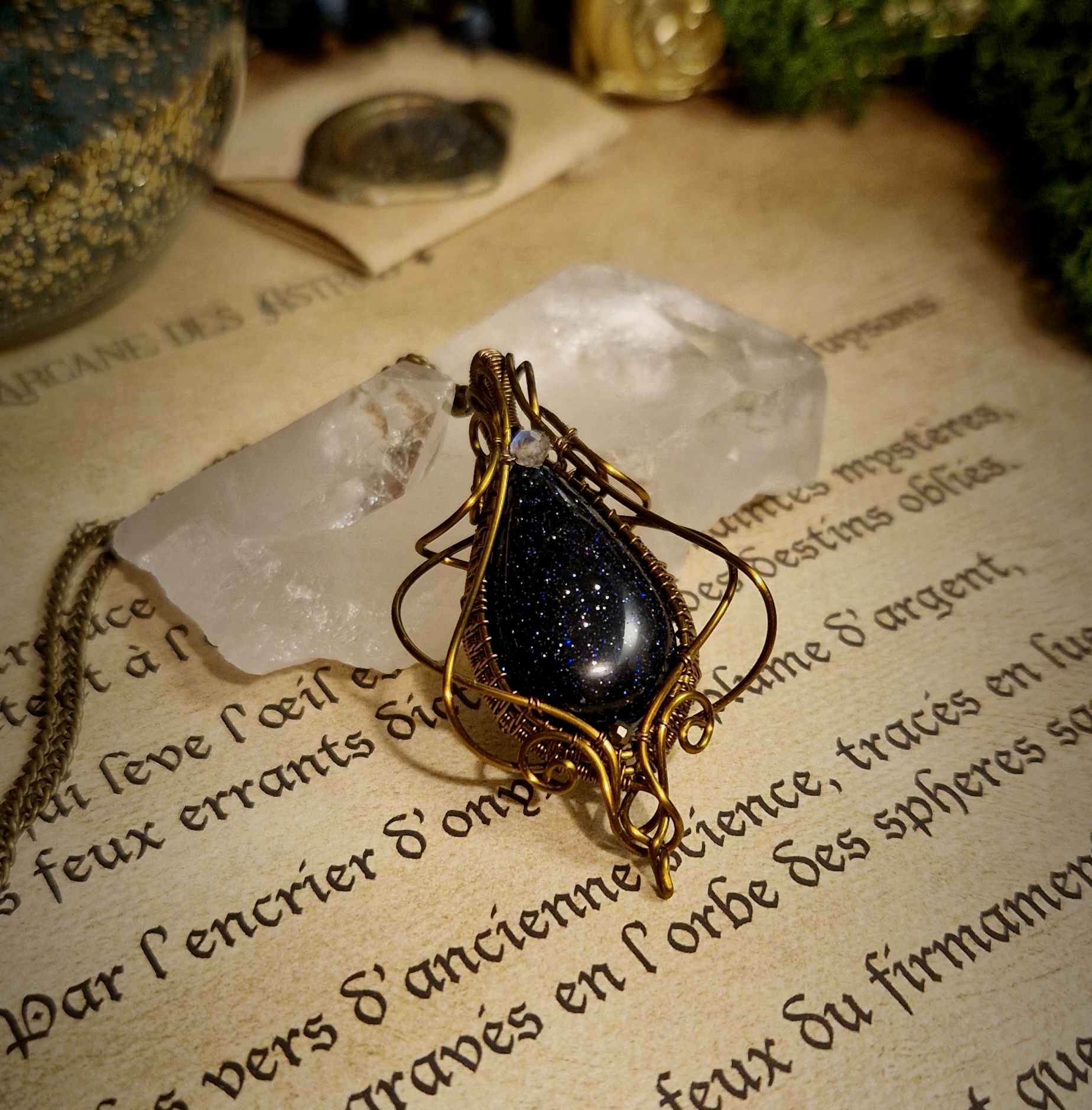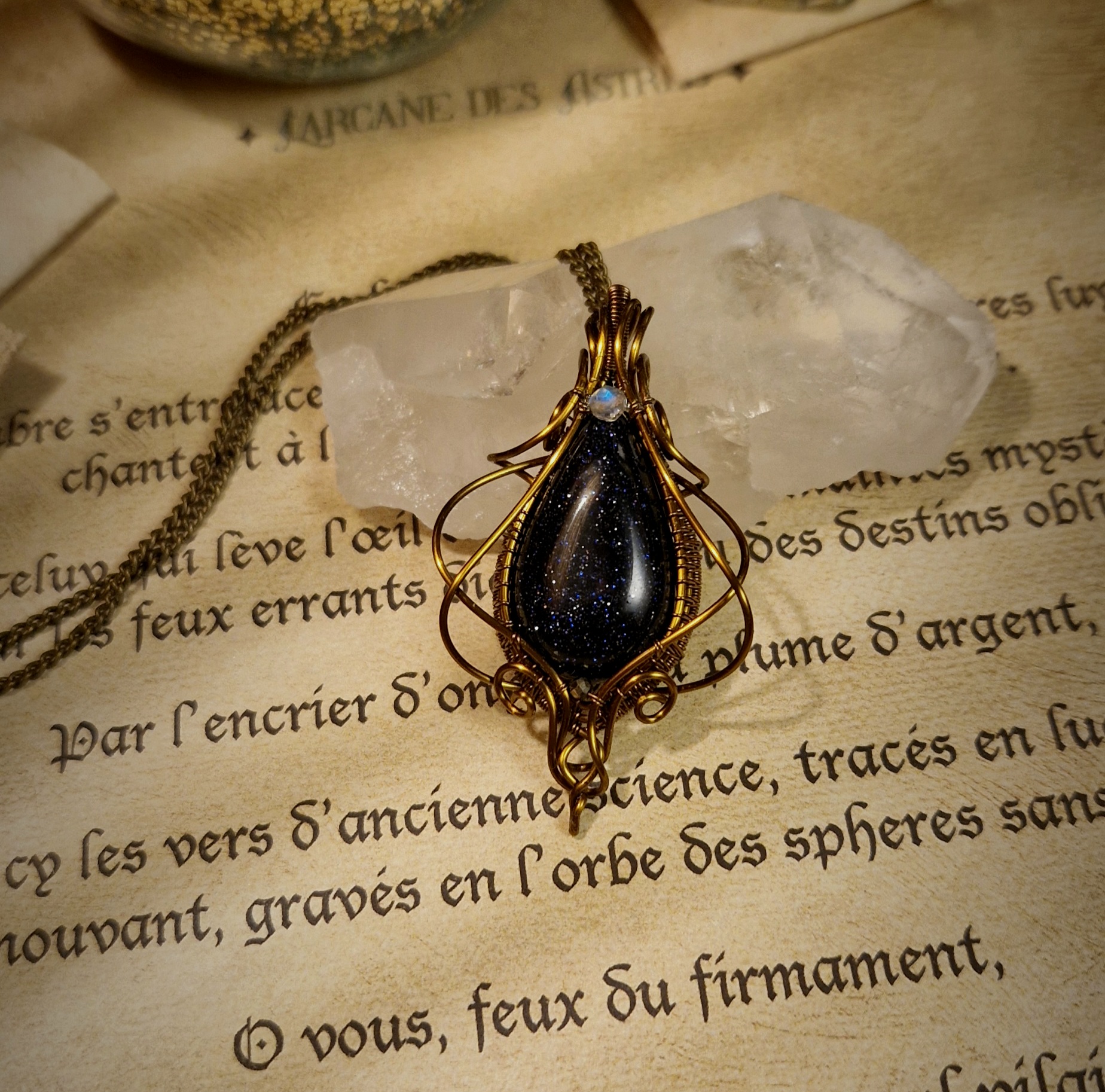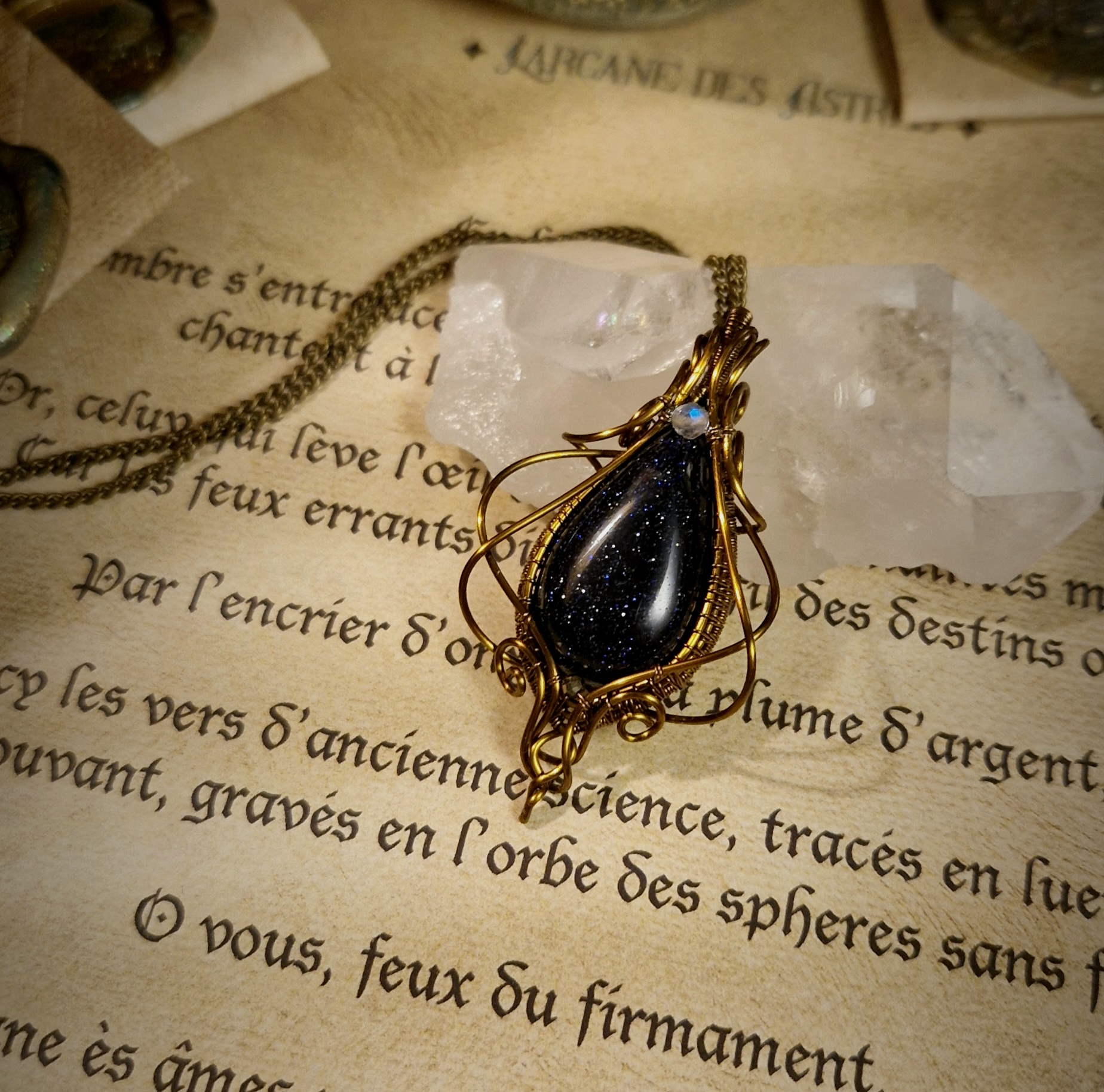 Née du savoir-faire des maîtres verriers et parsemée d’éclats scintillants tels des fragments d’étoiles, la pierre de sable bleu est une pierre synthétique créée par l’homme. Faite de verre et de cobalt ou de manganèse, elle est parsemée de milliers de micro-inclusions scintillantes de cristaux de cuivre, formés lors du refroidissement du verre, ce qui lui donne un aspect proche d’un ciel nocturne étoilé.